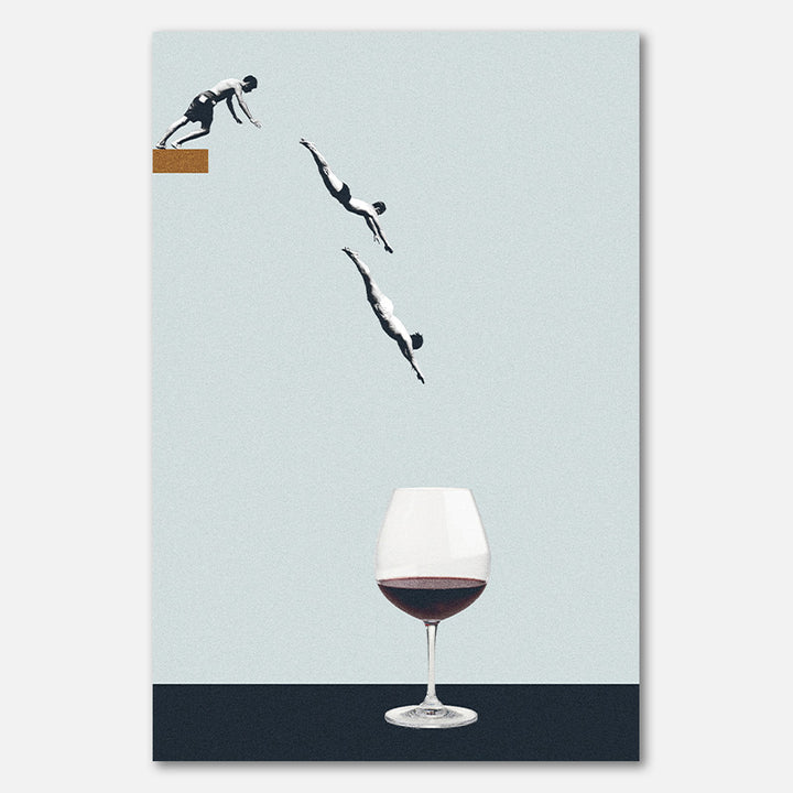 Dieses Gemälde bringt auf spielerische Weise den surrealistischen Moment zum Ausdruck, in dem Freunde gemeinsam Wein und Abenteuer genießen, und lässt dich vergessen, dass die Zeit vergeht. Die kreative Montage mit Tauchern und Wein passt perfekt in Interieurs im Mid-Century-, kreativen oder modernen Stil und zaubert immer ein Lächeln in dein Wohnzimmer.