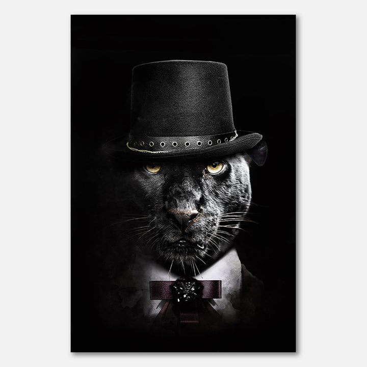 Diese einzigartige Wanddekoration zieht sofort die Aufmerksamkeit auf sich mit einem Panther, der stilvoll in klassischer Kleidung und Zylinder porträtiert ist. Die Kombination aus Eleganz und einem Hauch von Humor macht dieses Gemälde perfekt für moderne Innenräume und kreative Räume. Bringen Sie mit diesem besonderen Blickfang an der Wand eine verspielte, aber schicke Atmosphäre ins Zuhause.