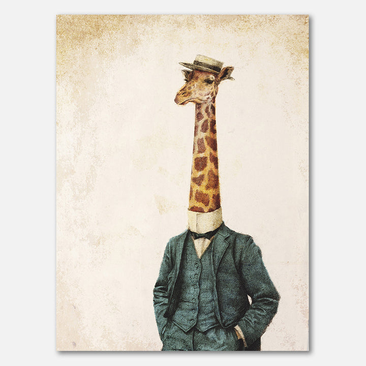Lassen Sie Ihr Interieur mit dieser Wanddekoration eines Giraffen in einem schicken Anzug und Zylinder hervorstechen. Das Gemälde strahlt eine humorvolle, vintage und surreale Atmosphäre aus und passt perfekt in ein retro-, eklektisches oder modernes Interieur. Verleihen Sie Ihrer Wand mit diesem einzigartigen, fantasievollen Blickfang Charakter.