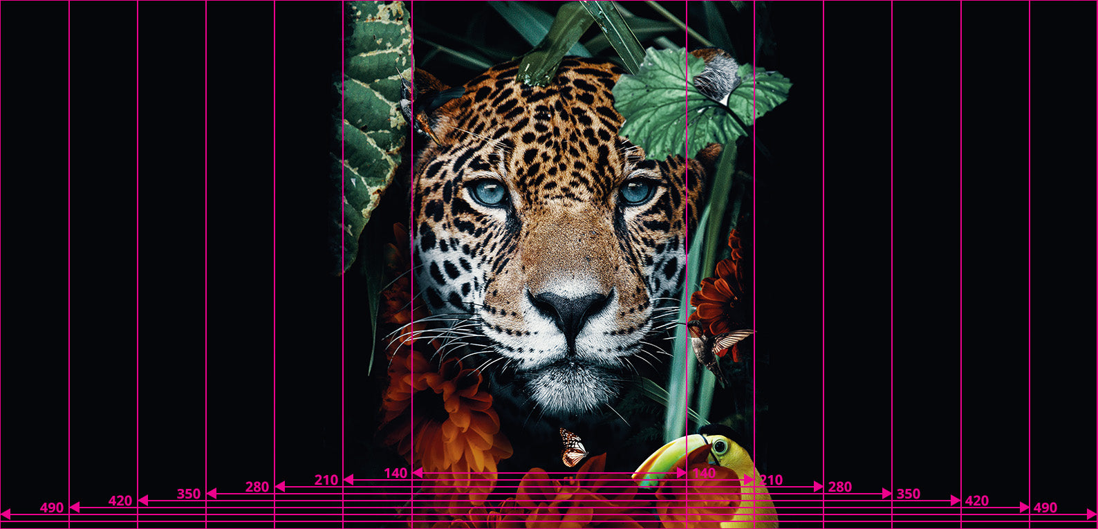 Posters: 148 x 148 cm | Alu-dibond: 150 x 298 cm | Plexiglas: 150 x 298 cm | Textielframe: 240 x 308 cm | Akoestisch paneel: 160 x 260 cm.