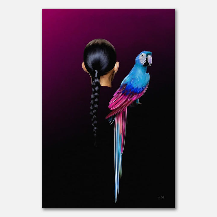 Dieses Poster ist wirklich etwas an sich. Ein stilvolles, aber gewages Design, das mit der nicht traditionellen Farbpurpur und Schwarz spielt. Das Selbstvertrauen strahlt von "Noelle" aus, einer Frau, die sie mit einem farbenfrohen Papagei auf der Schulter zurückgibt.