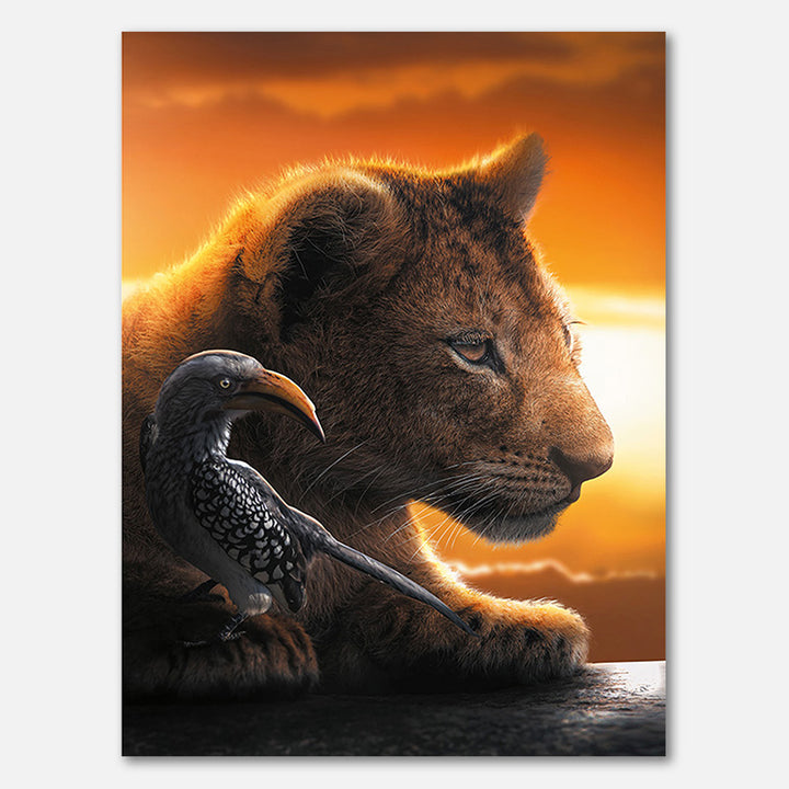 Ein Design eines jungen Löwen und eines Nashornvogels bei Sonnenuntergang.