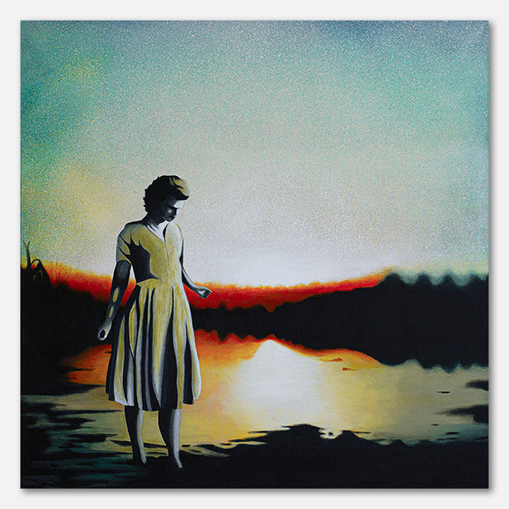 In Landschaftskunst "Tagen ohne Ende" ist eine Frau in der Eleganz einer verschwundenen Ära gekleidet. Ihre Silhouette, die an ein altes Foto erinnert, bewegt sich durch eine wässrige abstrakte Landschaft, die in kontrastreien Farben gemalt wird. Die untergehende Sonne wirft ihre letzten Strahlen über das Wasser.