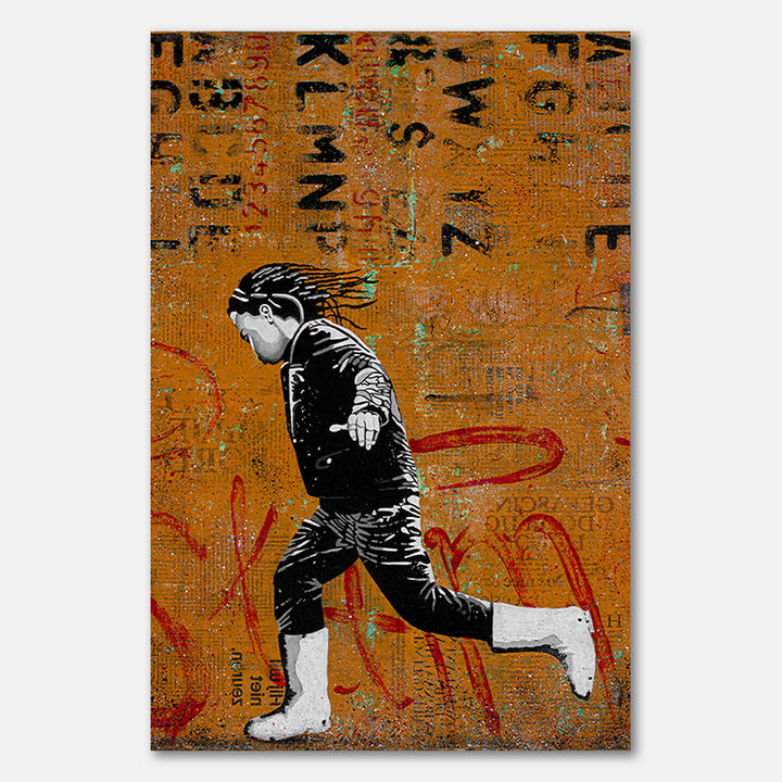 Das Originalmalerei ist ein Kunstwerk mit gemischten Medien / Collagen auf Leinwand. Hergestellt aus Papierschichten, Text und Briefe sichtbar. Acrylfarbe wurde in einer transparenten Schicht darauf aufgetragen. Schließlich habe ich den Jungen darauf gemalt.