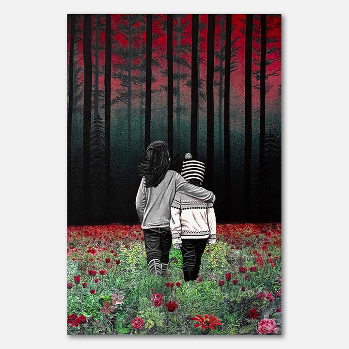 Zwei Kinder gehen zusammen durch ein Blumenfeld mit schönen roten Blumen, wo alles niog schön und fröhlich ist. Sie gehen zu einem dunklen Wald, wo sie durchkommen müssen, um dorthin zu gelangen, wo sie sein wollen. Sie gehen zusammen. Am Ende scheint das schöne rote Licht, was darauf hinweist, dass ihr Ziel erreicht wurde.