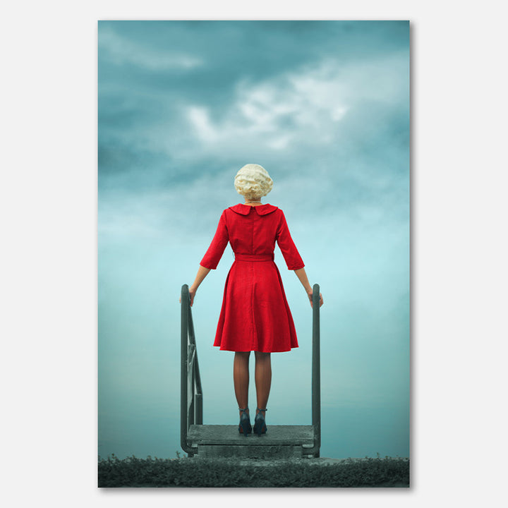Dieses Gemälde strahlt eine verträumte Atmosphäre aus, in der eine Frau in einem roten Kleid eine Treppe hinaufsteigt und von neuen Möglichkeiten träumt. Perfekt als Wanddekoration für Liebhaber von Fantasie, Freiheit und Nostalgie und bringt farbenfrohe Kreativität in Vintage-, Retro- oder moderne Interieurs.