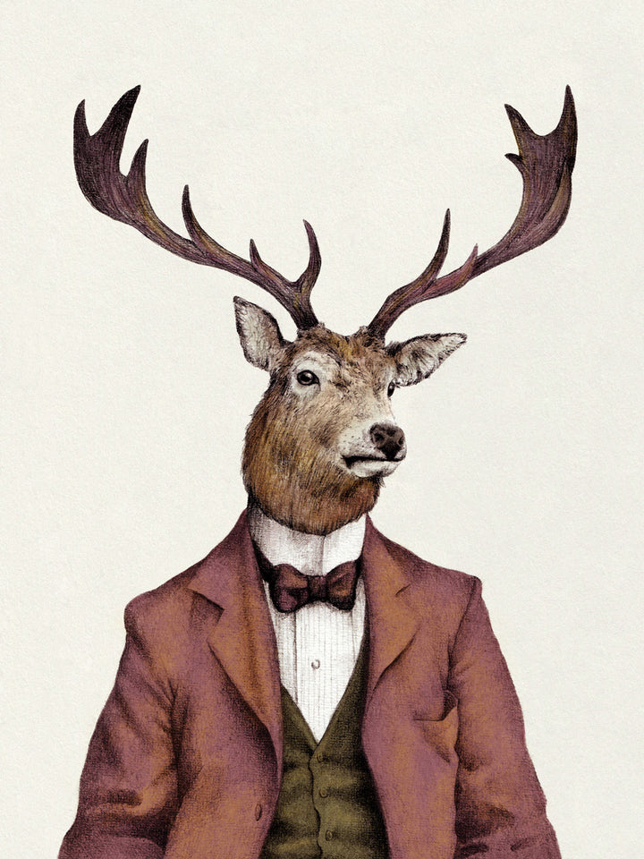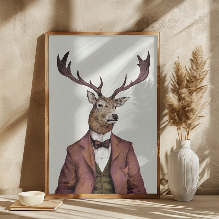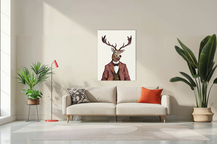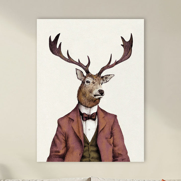 This painting brings a deer with impressive antlers, dressed in a stylish suit, vividly to life on your wall. The combination of animal elegance and human attire gives this wall decoration a unique, artistic look that fits perfectly in a vintage or modern interior. With its dreamy sepia tones and humorous, surreal touch, this artwork is a striking eye-catcher in any room.