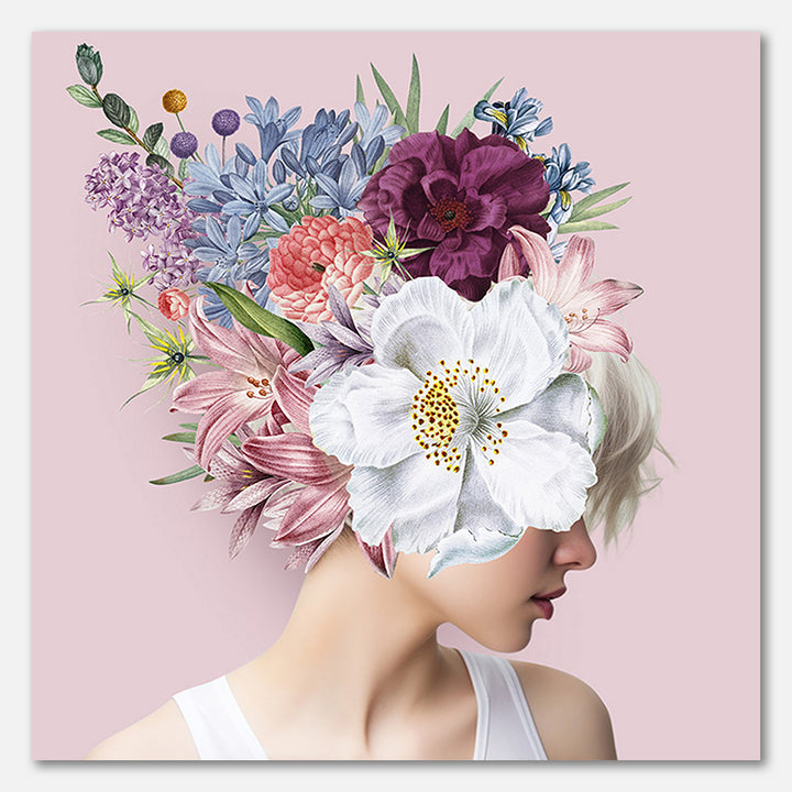 A light, romantic and summery fantasy portrait of a woman. In soft colors. Lovely but not too sweet. This is a digitally manufactured work, made up of various images. On a pink background. Modern art with a retro "vibe".