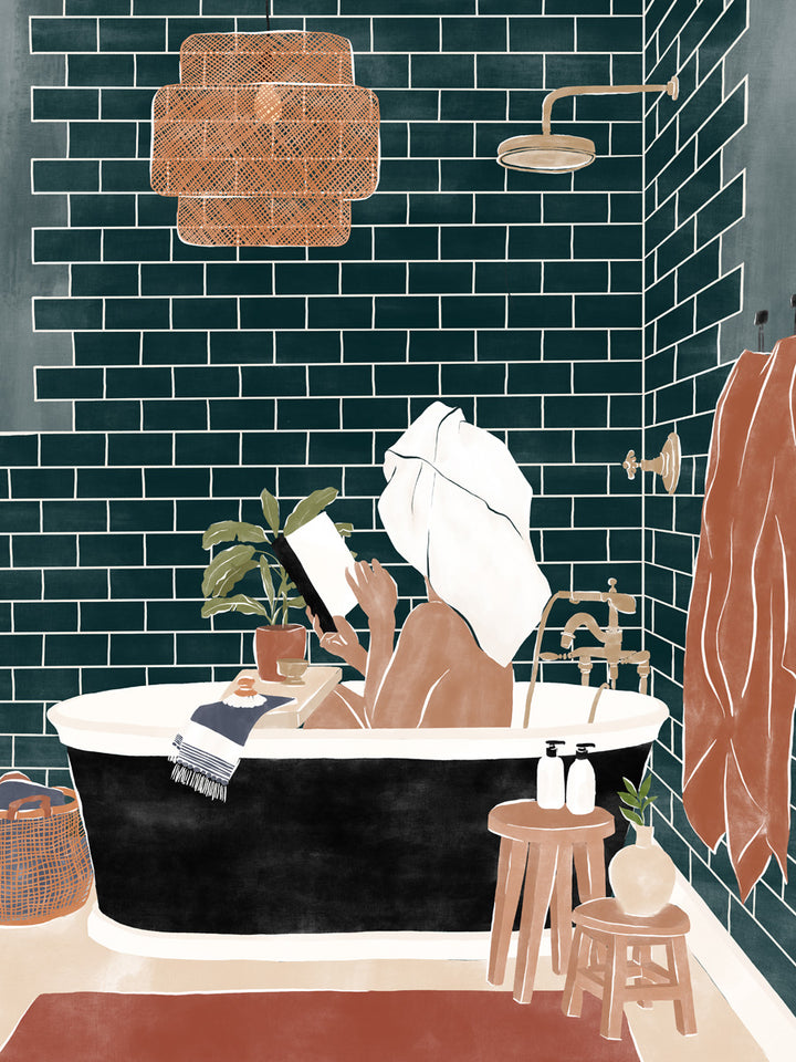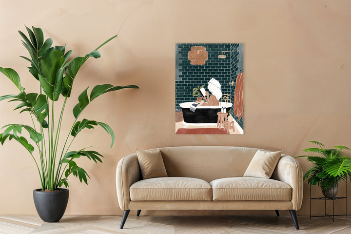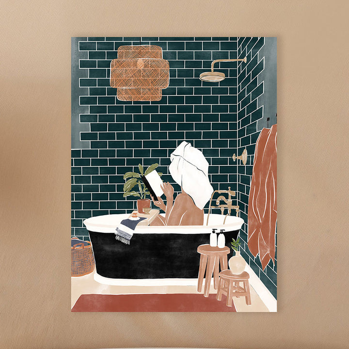 This wall decoration brings a relaxed atmosphere to your bathroom or reading nook, featuring a woman enjoying a good book in the bath. The figurative and graphic character of the painting fits perfectly within modern, minimalist, and atmospheric interiors. Ideal for giving any space a relaxed touch.