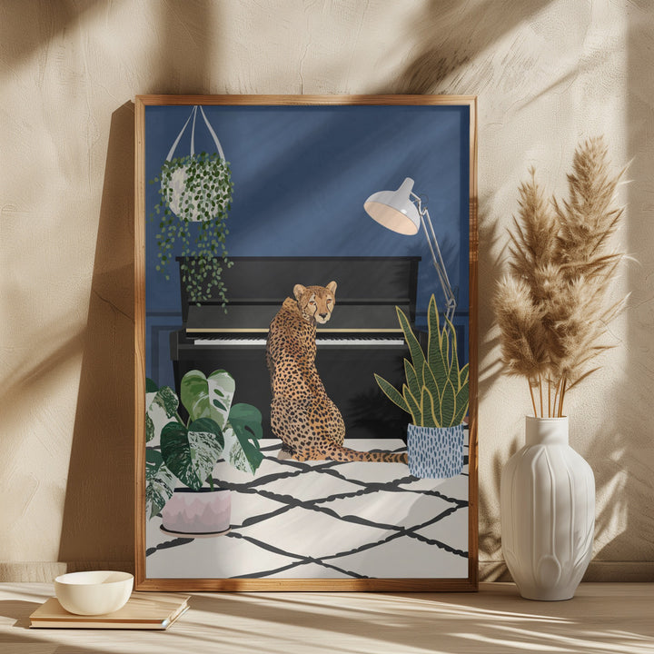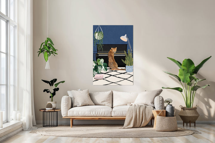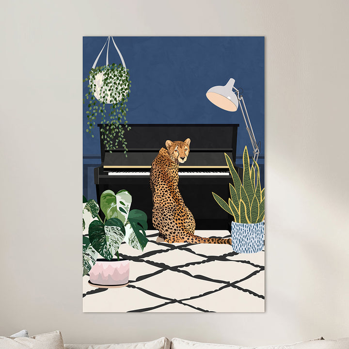 This cheerful wall decoration shows a cheetah playing the piano with full dedication, instantly bringing a smile to your face. The colorful illustration fits perfectly in a playful interior or a music room and brings a stylish, artistic atmosphere to any home. With this unique painting, you are guaranteed to give your walls a creative, special look.