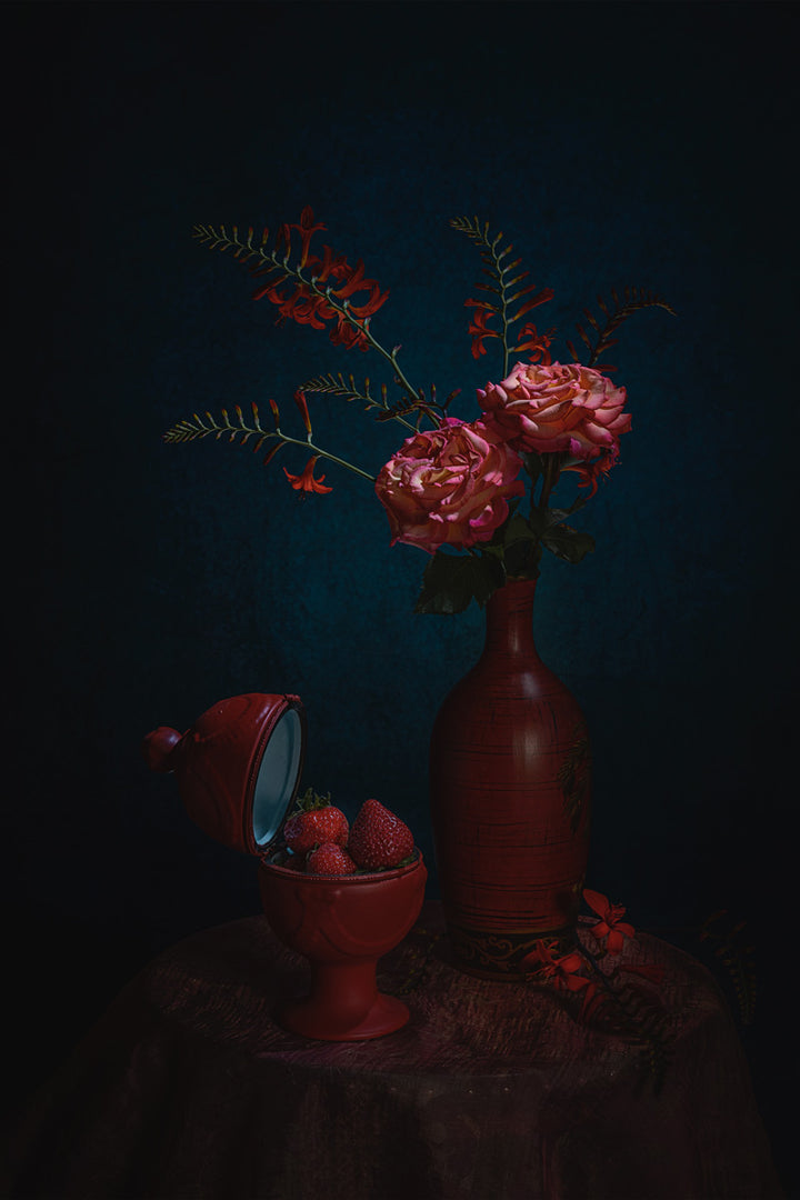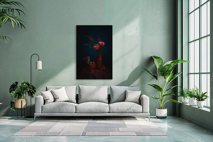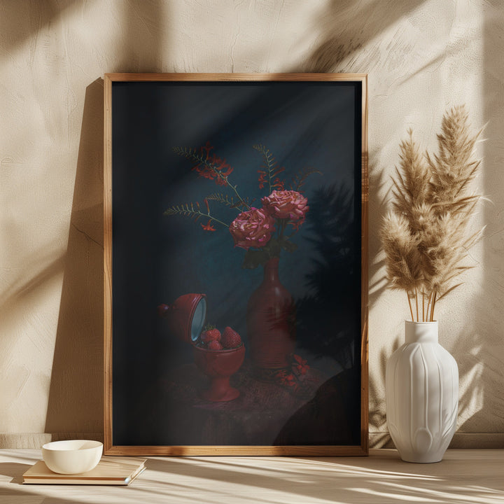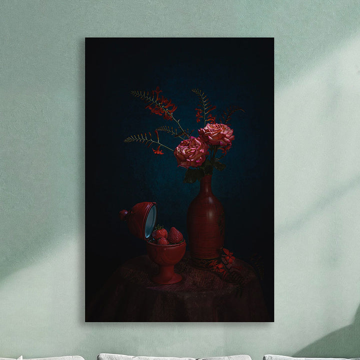 This wall decoration brings a contemporary twist to classic still life with vibrant red roses and fresh strawberries on a dark, atmospheric background. Perfect for modern living rooms and stylish kitchens where art and coziness come together. This painting exudes luxury and life.