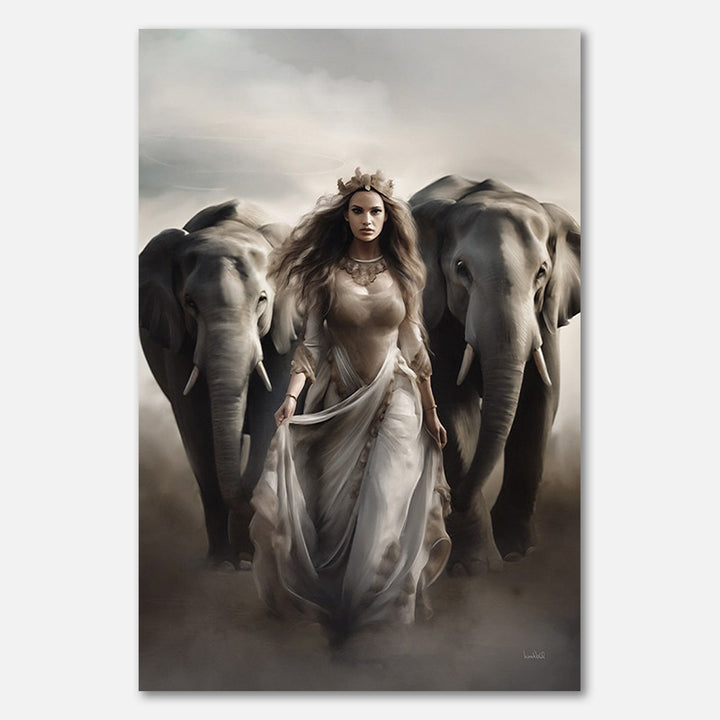 A woman arrives with two majestic elephants. The interaction symbolizes values ​​such as wisdom, strength and endurance. An iconic motive that you remind you that adventure is always within reach. Perhaps this design can be a source to strengthen and inspire your daily life?