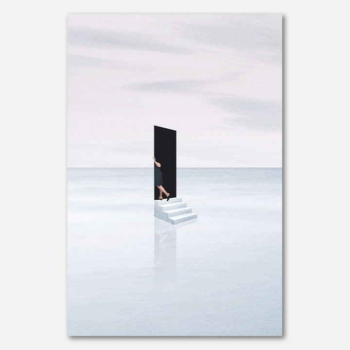 This painting takes you on a surreal adventure where doors, stairs, and mysterious passages are central. The figurative character and graphic style evoke a sense of escape and reflection, making it perfect for modern and mid-century interiors. Ideal for those who love creative, minimalist wall decor with a deeper meaning.