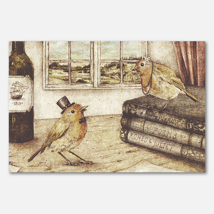 This painting brings a charming interplay of birds to life, wrapped in a vintage atmosphere full of romance and nostalgia. The wall decoration combines antique elegance with a playful, surreal twist, giving any room a warm, literary-tinged appearance. Perfect for lovers of animals, retro, and classic interior styles.
