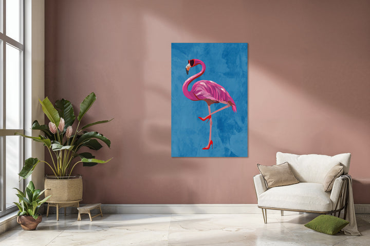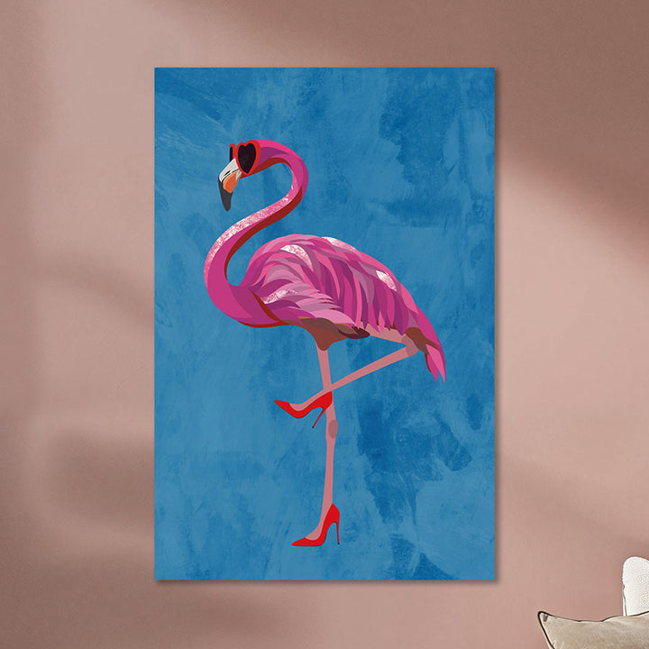 This painting instantly brings a smile to your face with a flamboyant flamingo in high heels and loving heart-shaped glasses. This wall decoration radiates feminine energy and humor, and fits perfectly in a modern, playful interior or in a room where you want to make a statement.