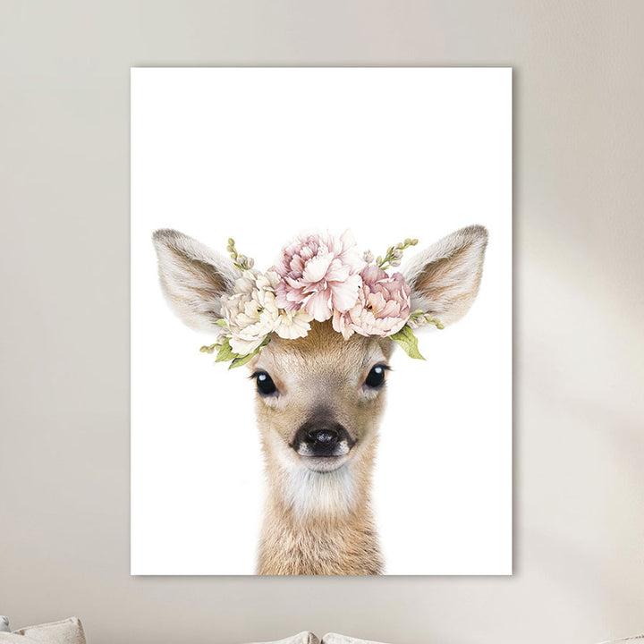 This sweet painting with a high cuteness factor shows a baby deer, surrounded by colorful flowers and soft, light tones. Perfect as wall decor for the nursery and ideal in a playful or romantic interior style. A must-have for animal lovers who want to make their space unique!