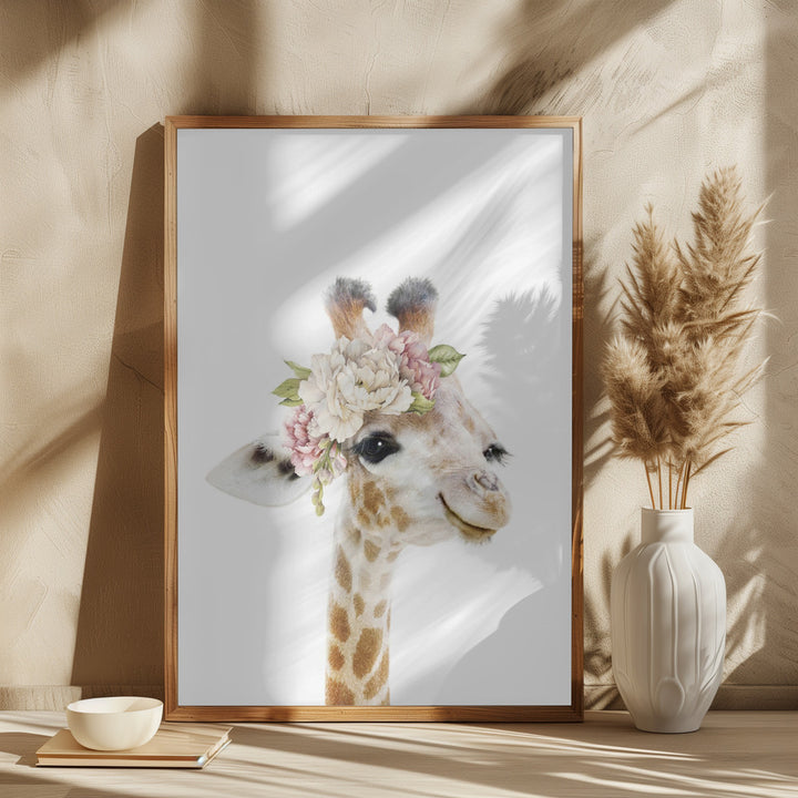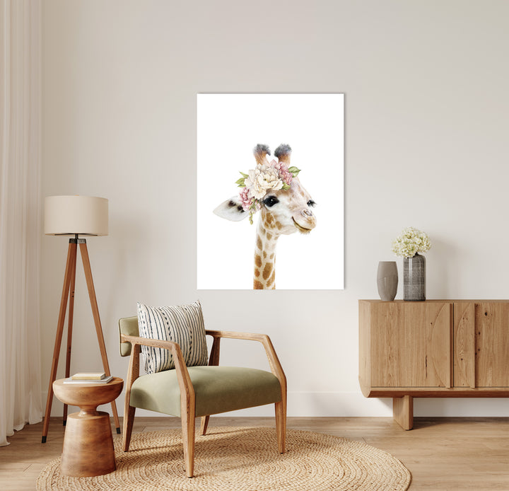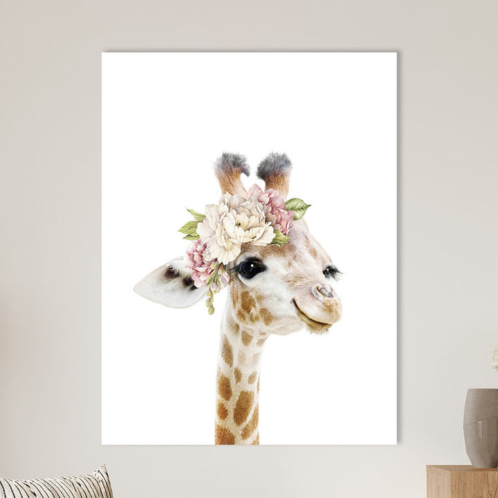 This cheerful wall decoration featuring a cute baby giraffe and flowers is perfect for a child's room or playful living room. With its bright colors and white background, this painting instantly brings a fresh, lively atmosphere to your interior. Let your space shine with this unique eye-catcher!