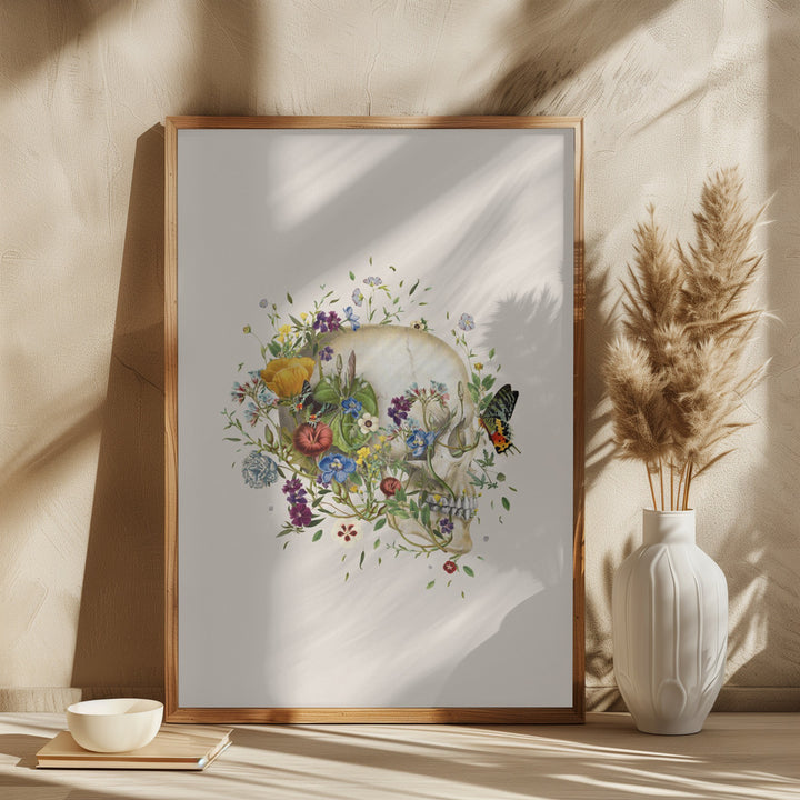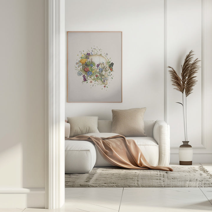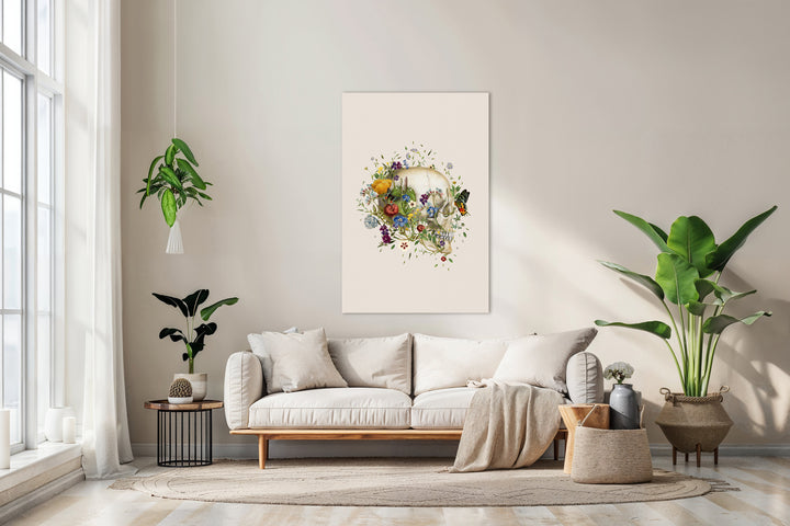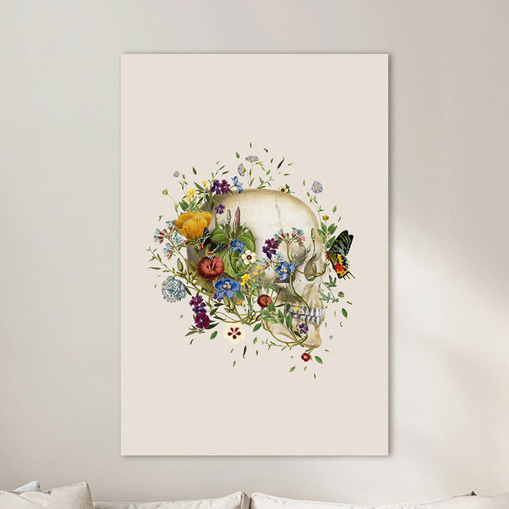 This vibrant wall decoration combines botanical beauty with a surreal skull, where colorful flowers and insects add a playful twist to any interior. Ideal for those who love striking, artistic accents and perfectly suited for modern, eclectic, or botanical living styles. This painting immediately catches the eye!