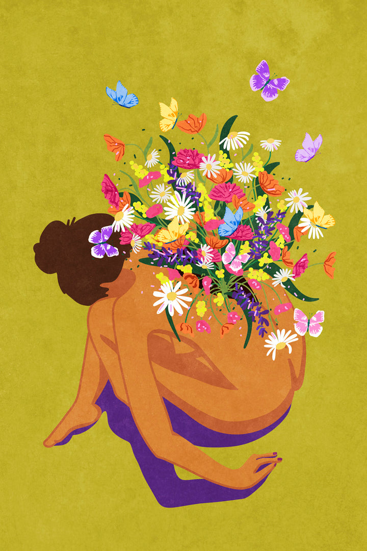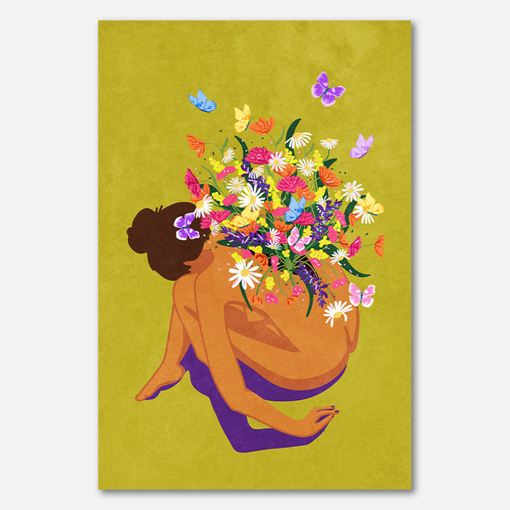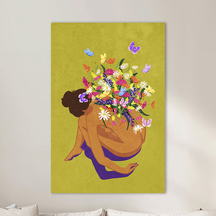 This colorful wall decoration combines a female body with botanical flowers and cheerful butterflies, creating a powerful and creative look. The surreal character fits perfectly with modern and creative interiors and brings an inspiring atmosphere to, for example, your bedroom or living room.
