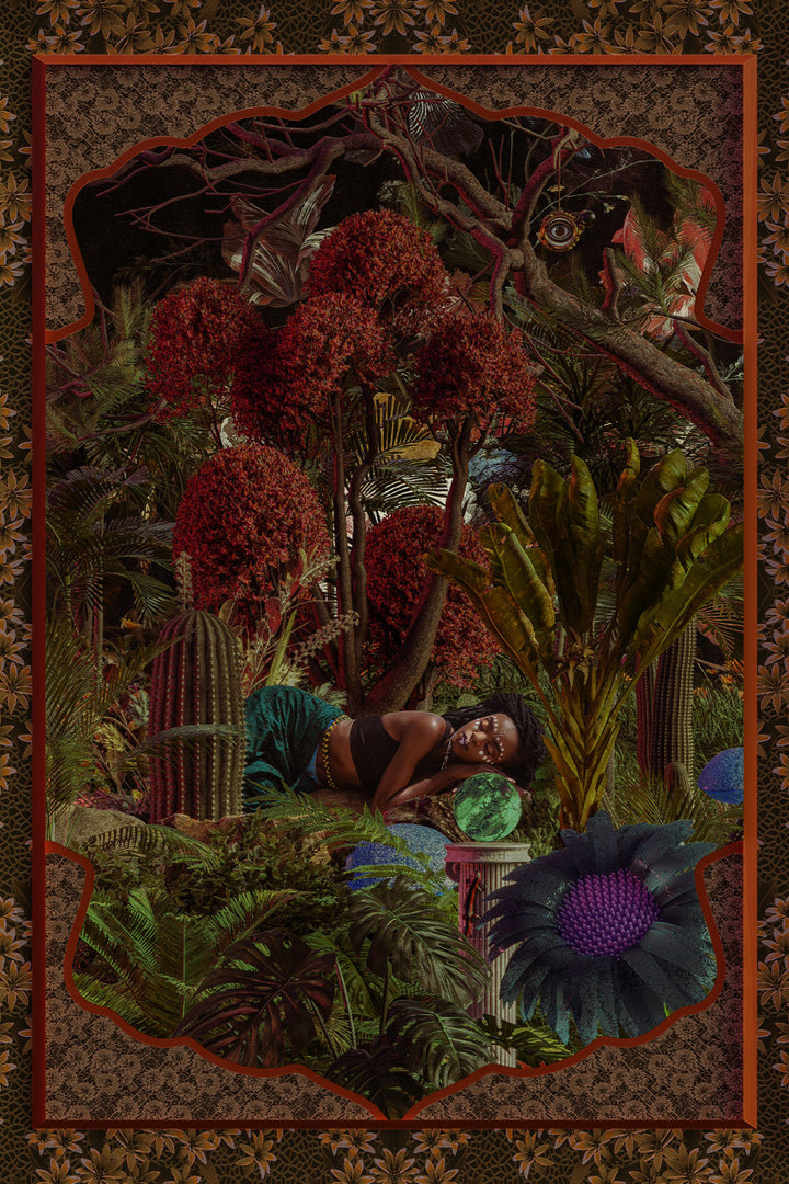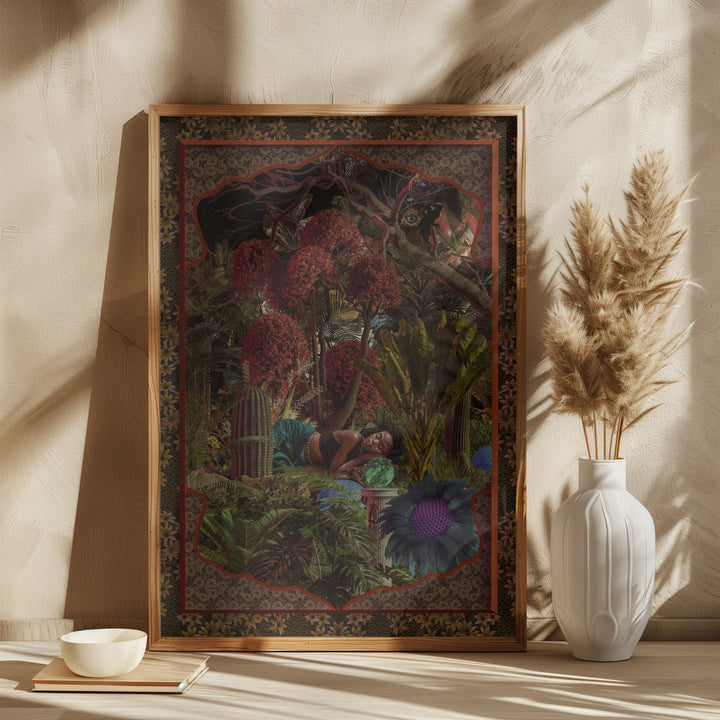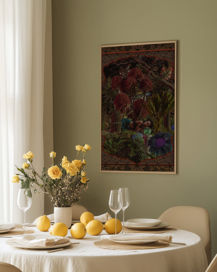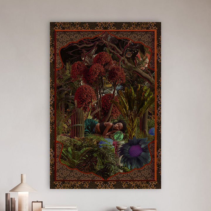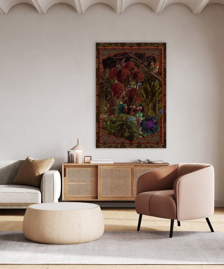 This painting takes you to a magical, botanical world full of vibrant colors and imaginative details. Perfect for a tropical or modern interior style, this wall decoration brings a cheerful, relaxed atmosphere to your home. Let yourself be inspired by exotic flowers, warm earth tones, and a touch of surrealism.