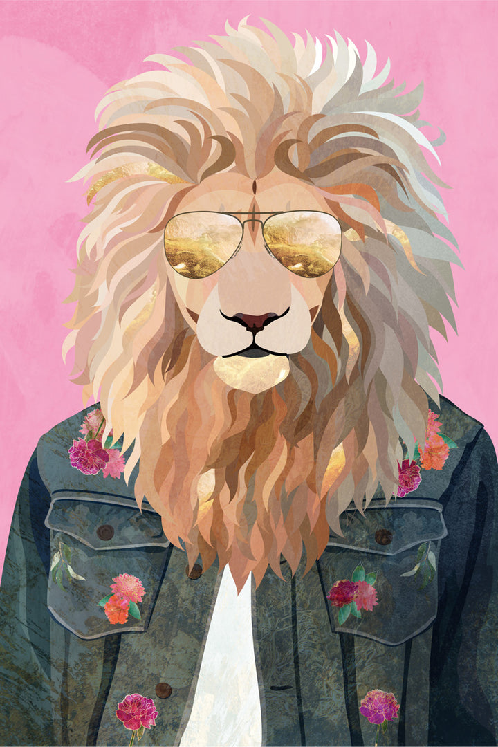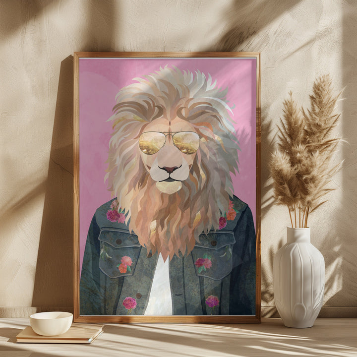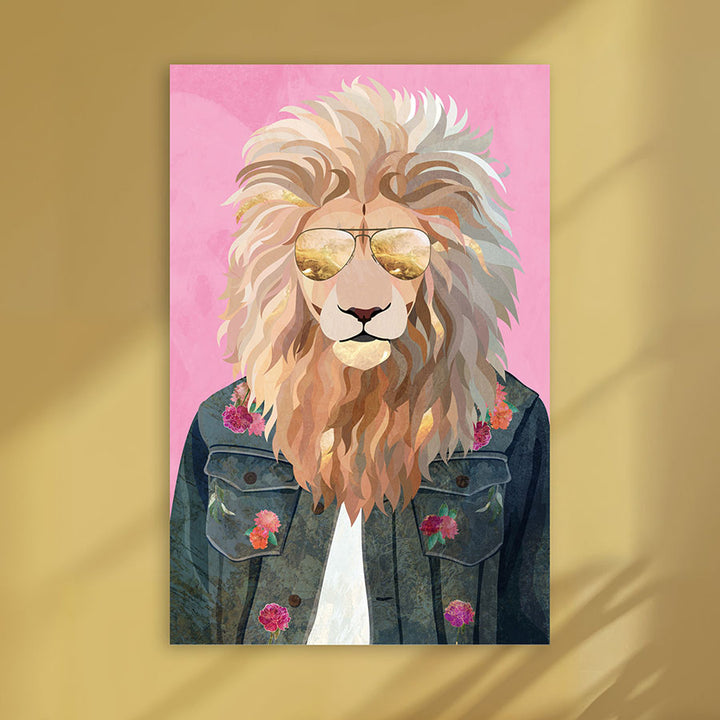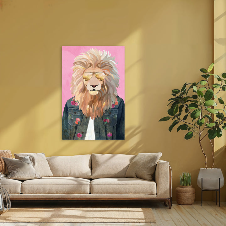 This wall decoration brings a stylish lion in a denim jacket and sunglasses to life, with a nod to 80s fashion and colorful street art. Perfect for modern interiors or rooms with a creative, wild vibe. Let your space shine with this cool, animal-themed painting full of character and flair.