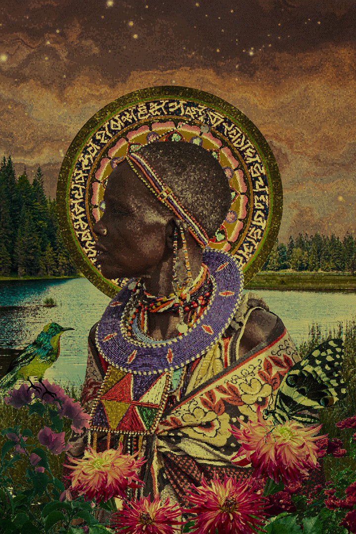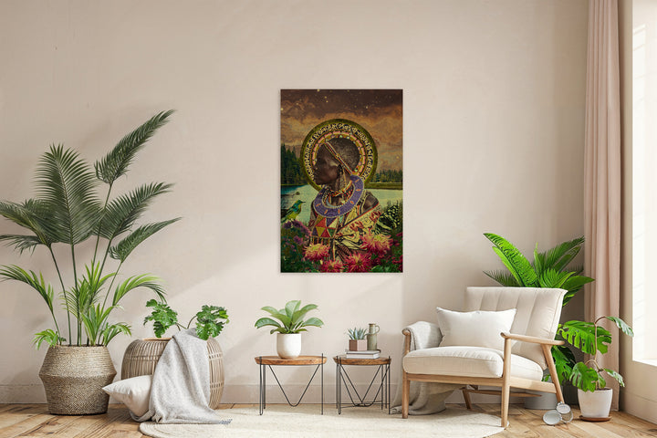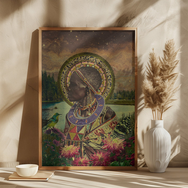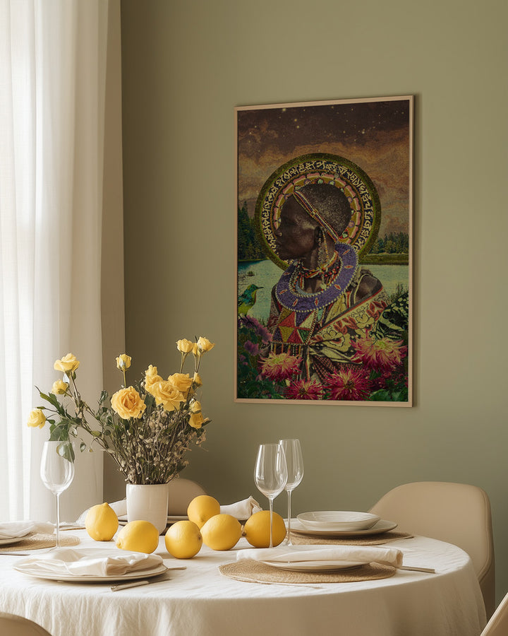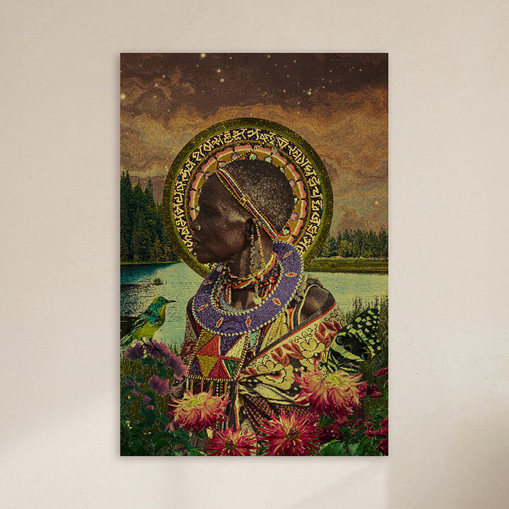 This painting captures the magic of the African night with a surreal collage where flora, jewelry, and a strong female figure come together. The elegant details and creative montage make this wall decoration perfect for modern and bohemian interiors, where unique visual art truly stands out.