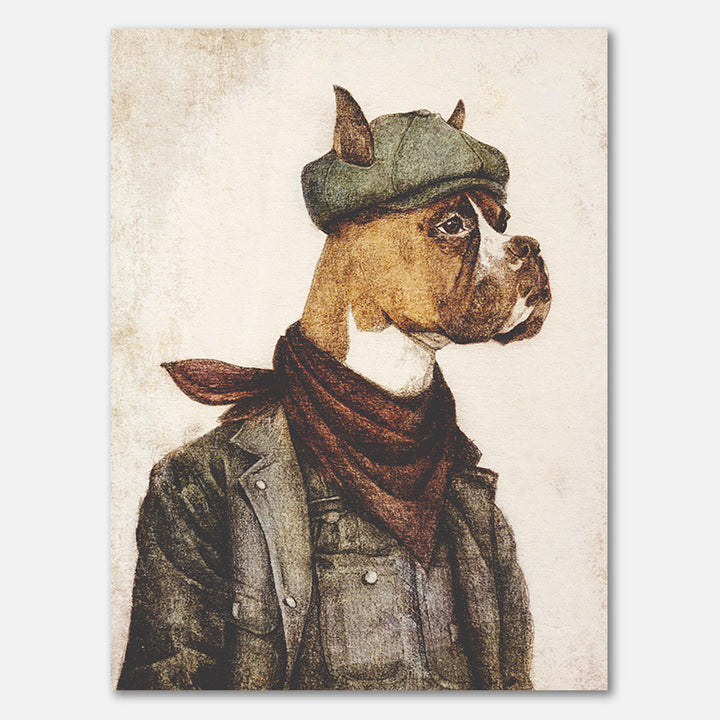 This painting brings a charming dog in classic clothing to life, perfect for lovers of vintage and retro wall decor. With its sepia tones and detailed portrait style, it fits beautifully in both rustic and modern interiors, adding a playful, unique atmosphere to any space.