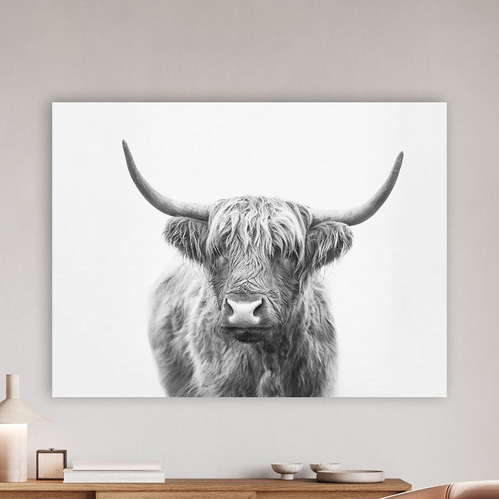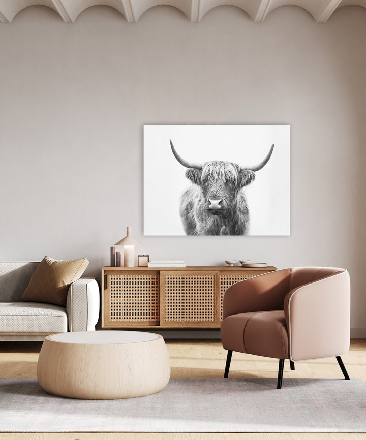 This painting brings the imposing presence of a Highland bull to life with a bright white background and a powerful black-and-white contrast. The wall decoration fits perfectly with a rustic or Scandinavian interior and instantly adds character to any modern or bohemian space. With its rugged animal head and striking horns, this wall decoration creates a unique, rustic atmosphere in the home.