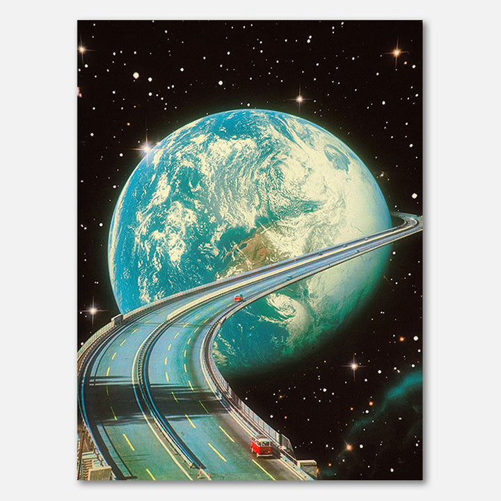 What if the road home ran directly through the universe? This surreal artwork combines retrofuturism with a touch of science fiction: a highway that curls around the earth, as if traveling between planets is the most normal thing in the world. A perfect print for dreamers, travelers and everyone with an endless love for the unknown.