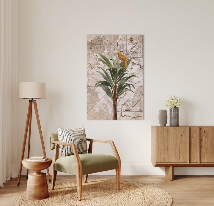 Immerse your interior in a tropical paradise with this wall decoration full of exotic birds, wild animals, and lush palm trees. The vibrant jungle atmosphere instantly creates a nostalgic and vintage look, ideal for both modern living rooms and retro and bohemian interiors.