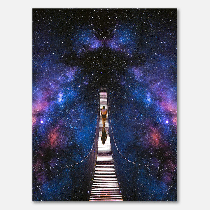 A floating bridge that extends into the infinite, surrounded by a magical universe full of stars and mists. This artwork symbolizes the journey to the unknown, a path full of mystery and possibilities. Perfect for dreamers, adventurers and everyone who is fascinated by the infinite. Be inspired by the cosmos and take the first step towards the unknown.