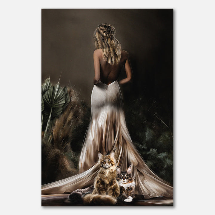 Isa with her two sweet cats! Here the beautiful dress is central and the cats act as a nice accessory. This design has a maximalistic style and because of the detailed level we recommend one of the larger sizes.
