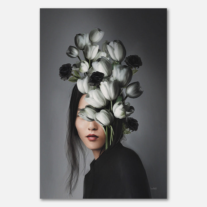 A surreal design dominated by black, gray and white. A bouquet of tulips and roses comes from the collar. A very style distribution poster! Fits with most houses and interior styles.