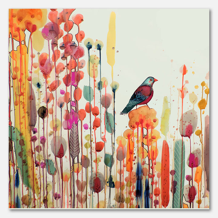 Deze vierkante wanddecoratie barst van de levendige kleuren en vrolijke vormen die direct een gevoel van optimisme brengen. Het schilderij past perfect in moderne interieurs en Scandinavische settings, maar staat ook prachtig in eclectische woonkamers. Ideaal voor iedereen die zijn huis wil opfleuren met eigentijdse wanddecoratie.