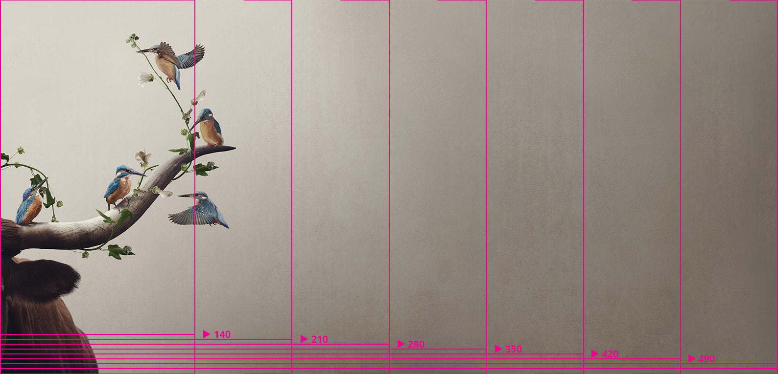 Design on wallpaper of a group of kingfishers on the horn of a bull.