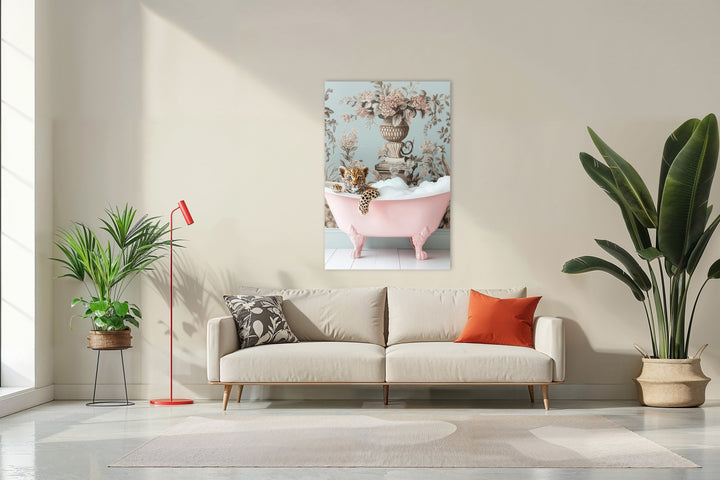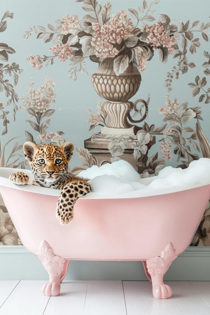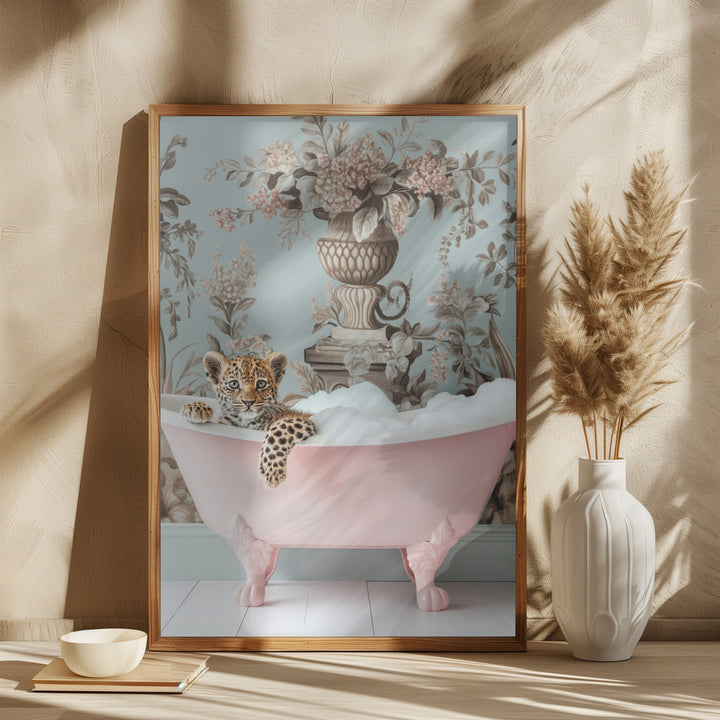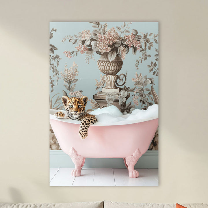 This painting brings a playful atmosphere to your interior with a baby leopard enjoying a pink foam bath. The wall decoration radiates softness in baby blue and baby pink, perfect for the bathroom or nursery. Matches beautifully with modern, cheerful, and colorful interior styles.