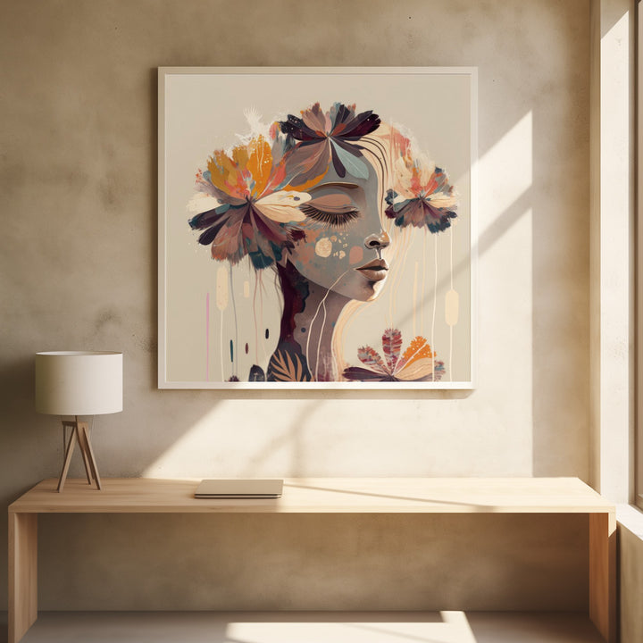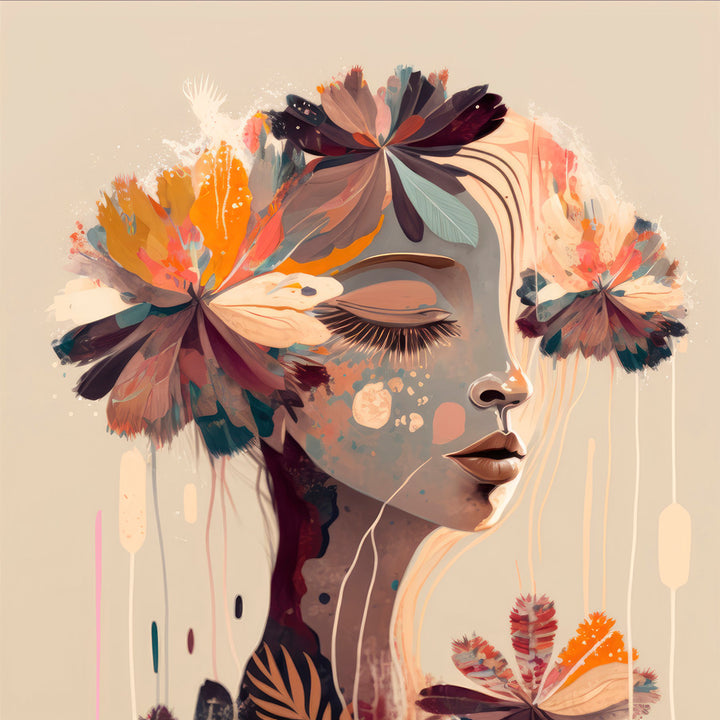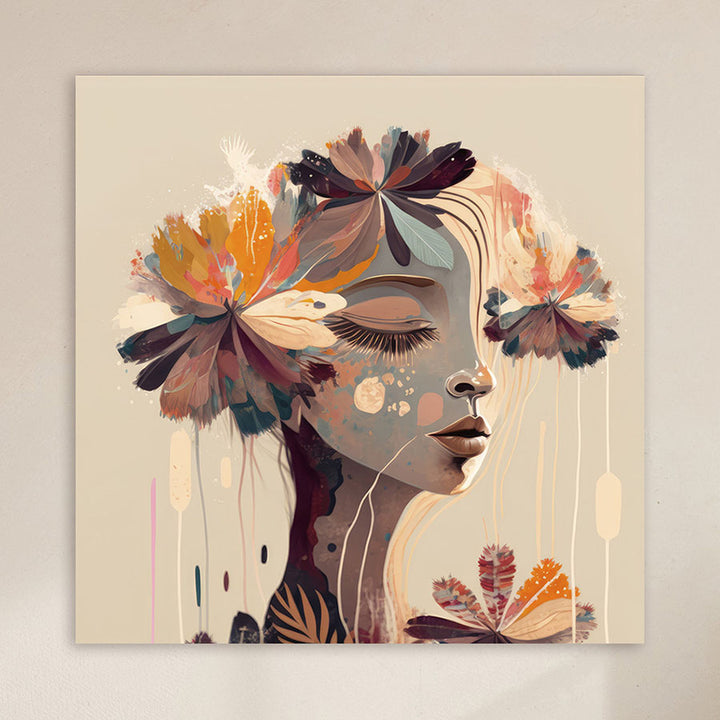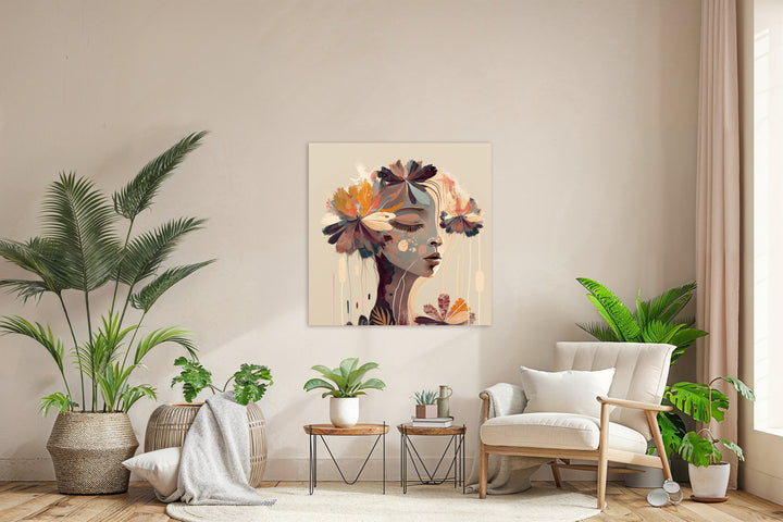 This wall decoration brings a contemporary touch to your interior with its abstract female portrait, playful botanical shapes, and soft beige colors. The painting radiates warmth and combines multicultural influences with a natural, dreamy atmosphere, perfectly suited to modern, minimalist, and bohemian living styles.