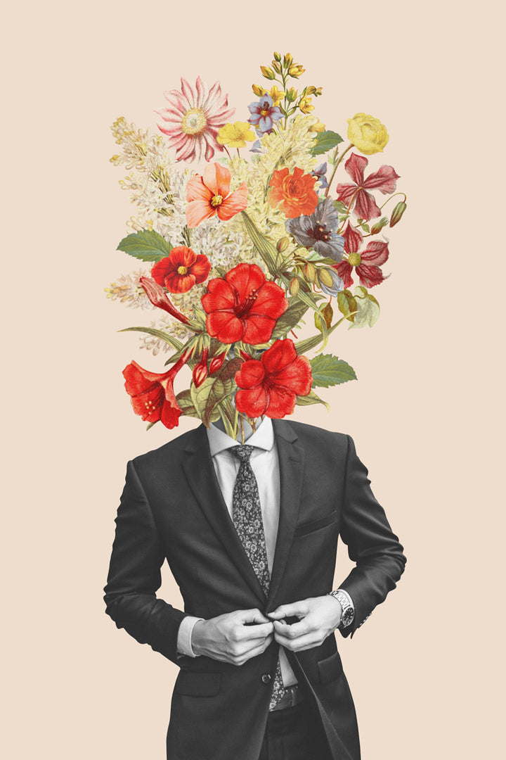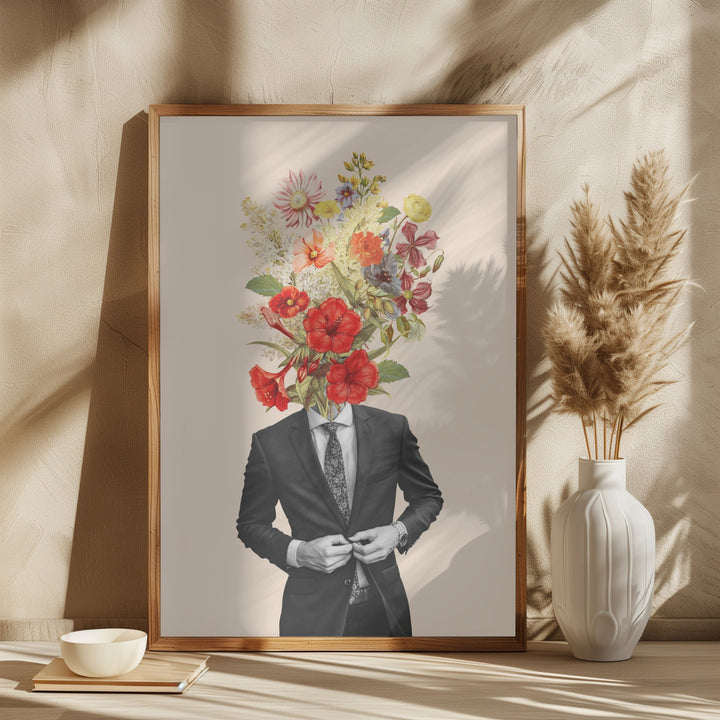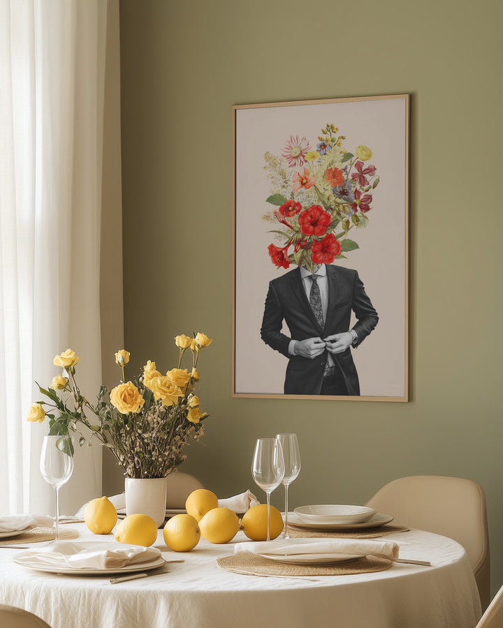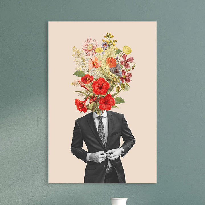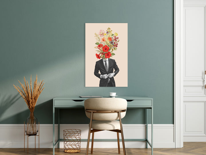 This unique wall decoration features a man amidst lush red flowers, creating a dreamy and surreal atmosphere in any room. Perfect for lovers of botanical and creative design, and fits especially well with modern and artistic interiors. Add this painting for a striking style accent in your home.