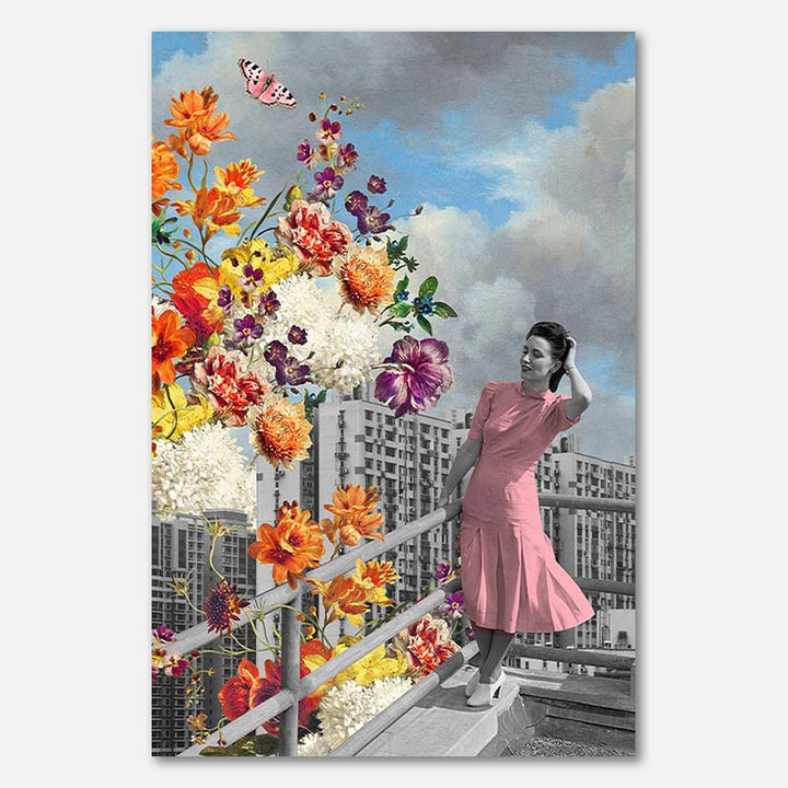 It is said that this really happened. I give it the benefit of the doubt .... This is a digitally manufactured collage of various antique, vintage and retro images. Together they form the portrait of a woman, enjoying sun, flowers and views of the city, from great heights.