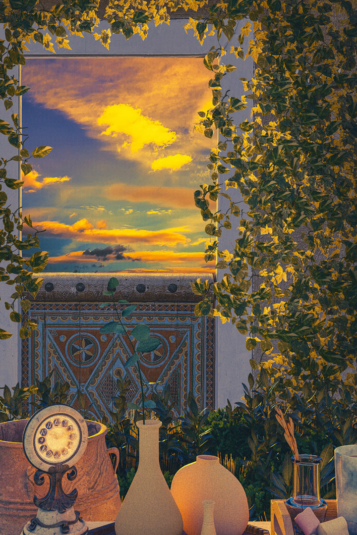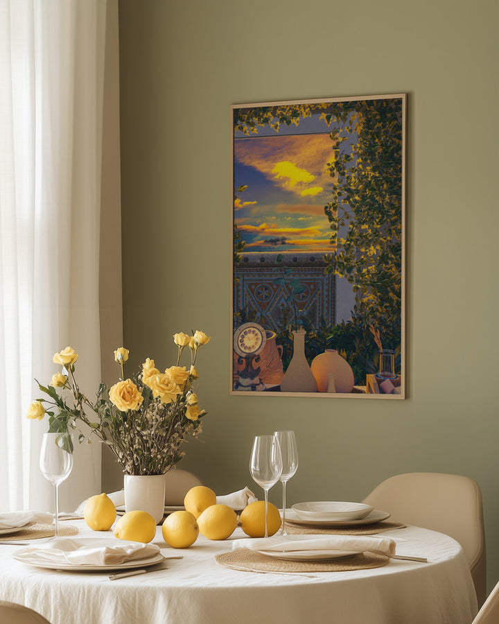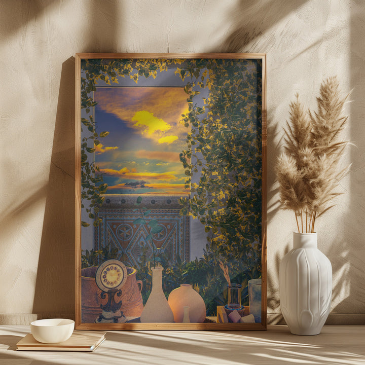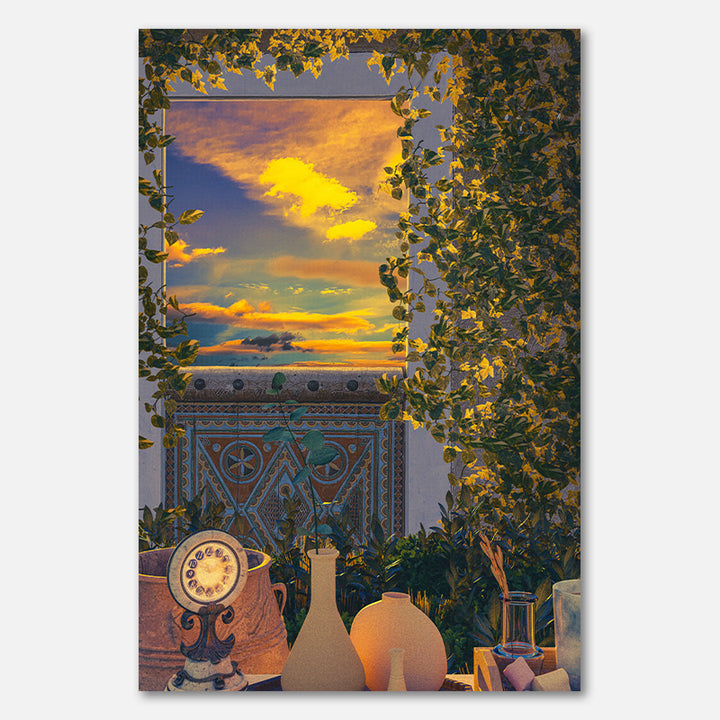 This painting captures the atmosphere of a dreamy evening full of colorful plants, architectural shapes, and a setting sun, perfect for lovers of botanical details and creative illustrations. This wall decoration fits effortlessly into modern, minimalist, or creative interiors and brings the quiet of the evening to any home.