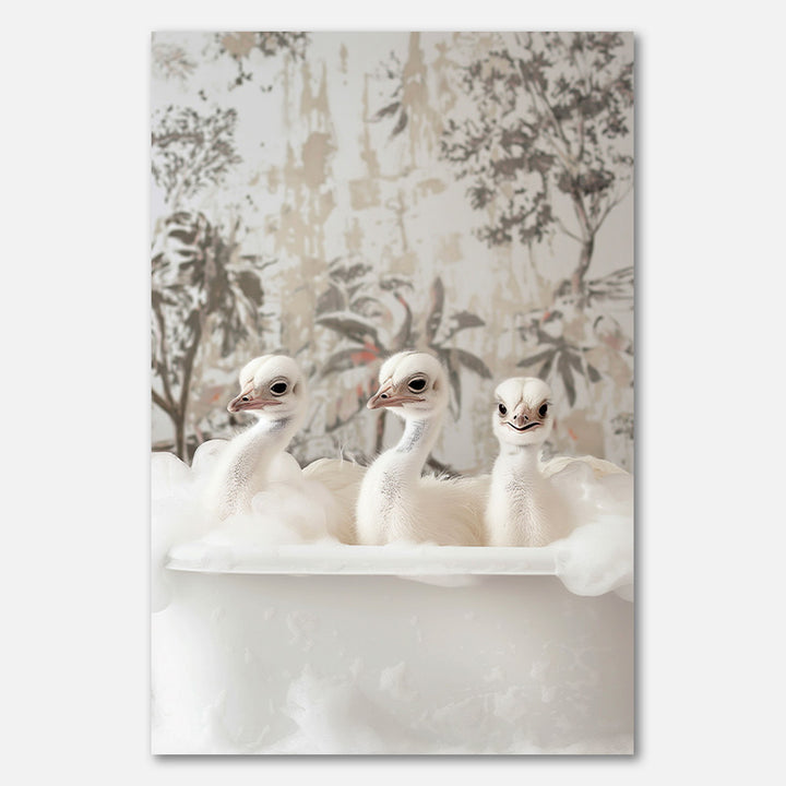 This cheerful painting brings a funny ostrich taking a bath to life and instantly puts a smile on your face. With soft white and gray tones, this wall decoration fits perfectly in the bathroom, children's room, or nursery. The high key style makes it a fresh, playful addition to any modern interior. Perfect for lovers of baby animals and birds, and ideal for giving any space a light, playful atmosphere.