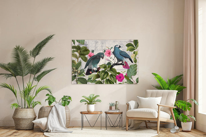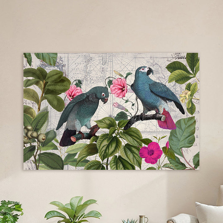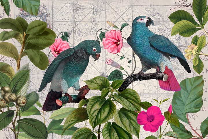 Immerse your interior in a nostalgic atmosphere with this wall decoration featuring colorful parrots proudly displayed among tropical flowers and leaves. The exotic theme brings a retro vibe that perfectly suits botanical interiors or spaces with a vintage look. Effortlessly brighten up your living room and give every room a unique, lively twist.
