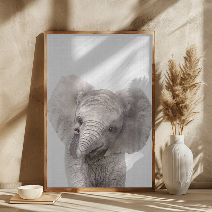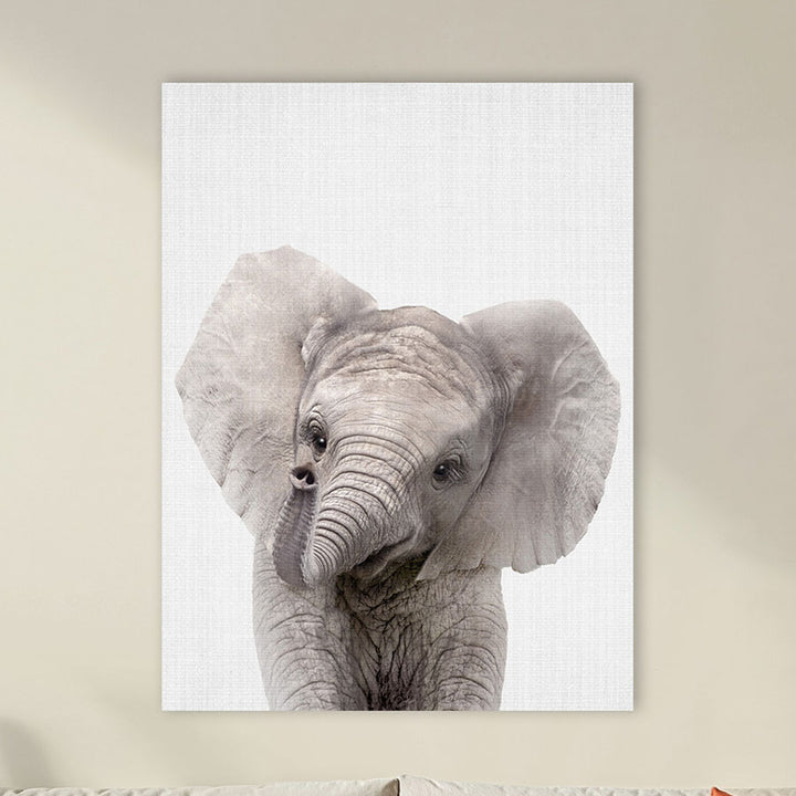 This cute wall decoration shows a baby elephant up close and immediately brings a smile to your home. With its playful, sweet appearance, this painting fits perfectly in children's rooms but also looks great in modern or Scandinavian interiors. The timeless design without a background makes the baby elephant stand out even more.
