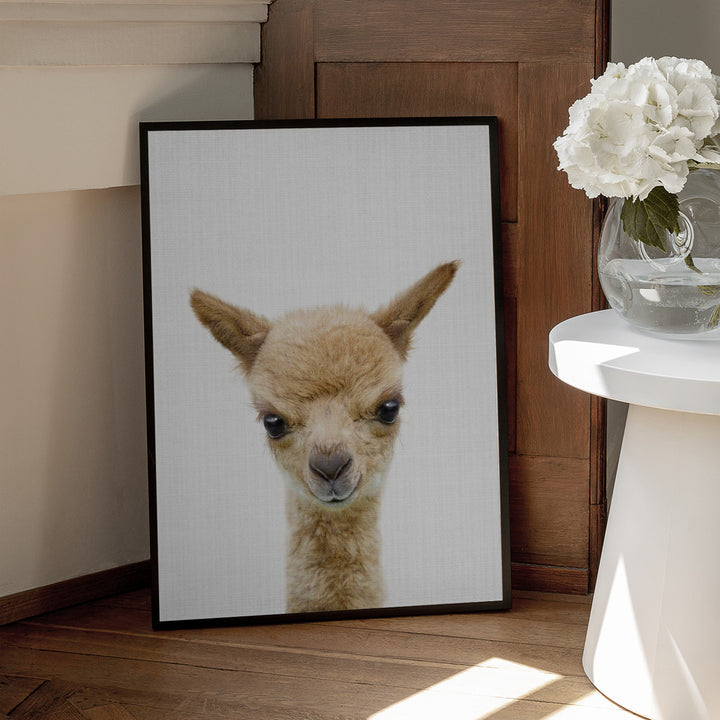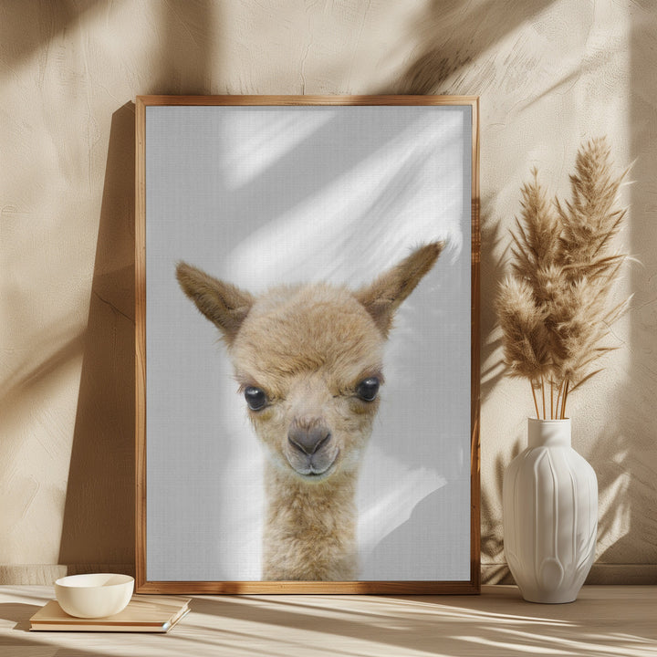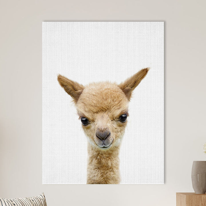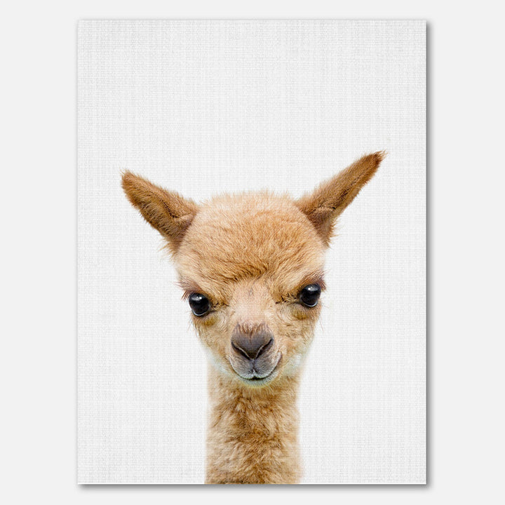 This cheerful wall decoration featuring a cute baby llama is guaranteed to steal the show in any children's room or modern interior. The painting exudes a soft, rustic atmosphere thanks to the bright, minimalist background. This perfectly suits a Scandinavian, rustic, or contemporary living style and adds a playful accent to your space.
