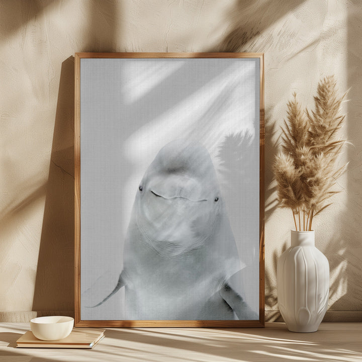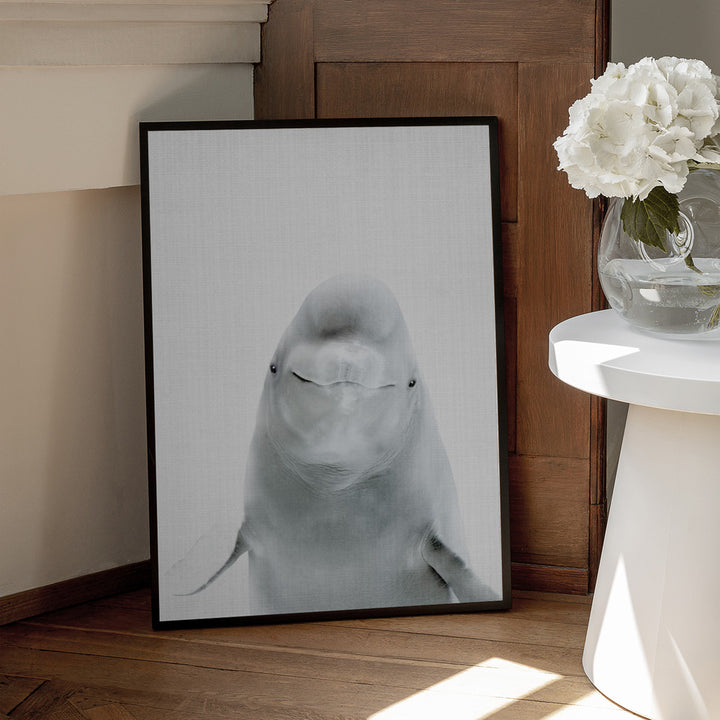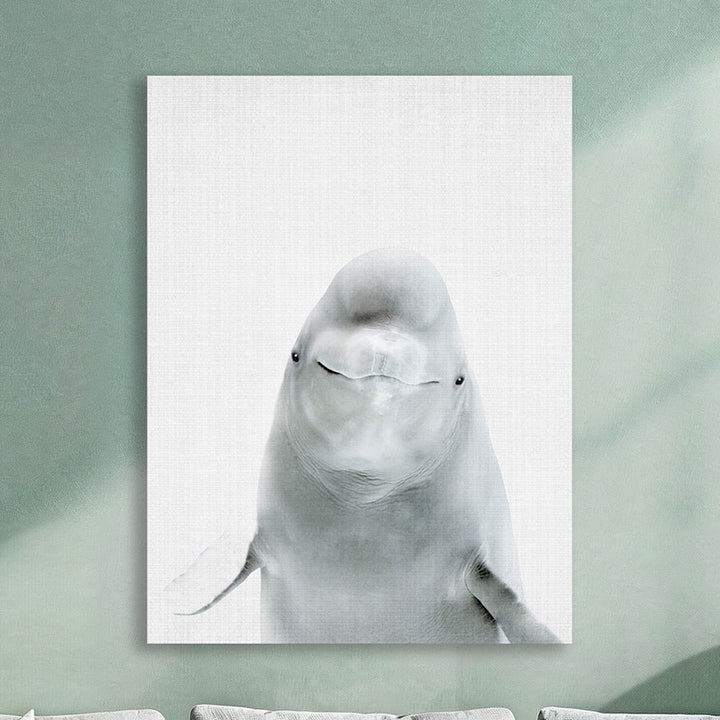 This charming wall decoration brings a playful beluga whale to life in stylish black and white tones, perfectly suited for a modern or Scandinavian interior. The painting exudes calm and adds a special twist to any room, ideal for lovers of maritime or animal themes.