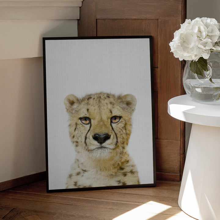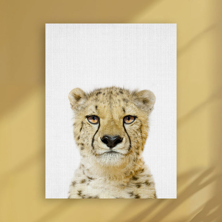 This wall decoration featuring a curious cheetah instantly brings playfulness and character to your interior. Perfectly combined with modern, minimalist, or children's room styles, this painting creates a contemporary, cozy atmosphere. A true eye-catcher for animal lovers and anyone who appreciates unique wildlife art.
