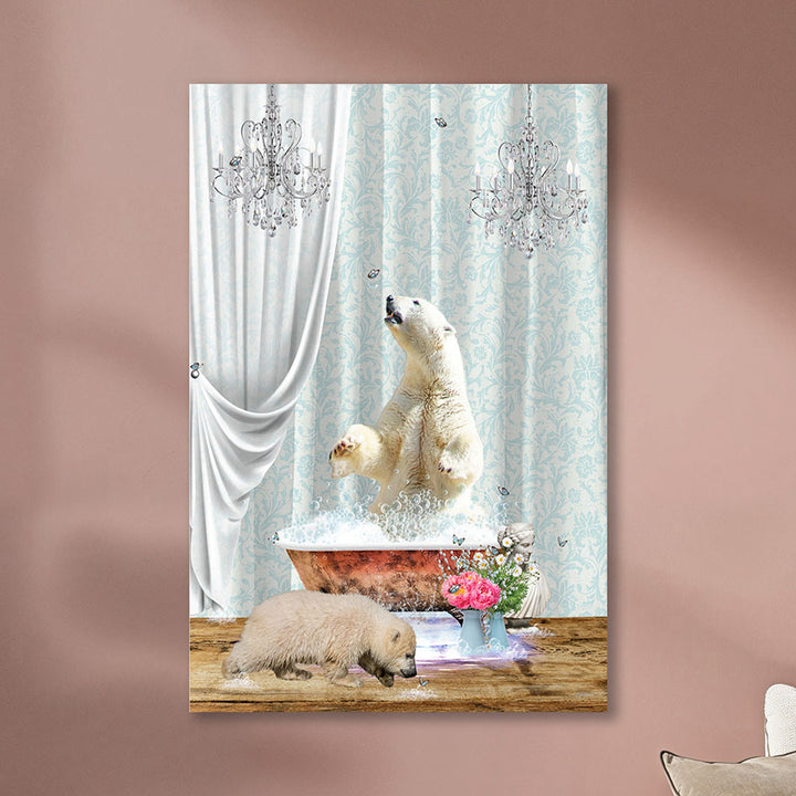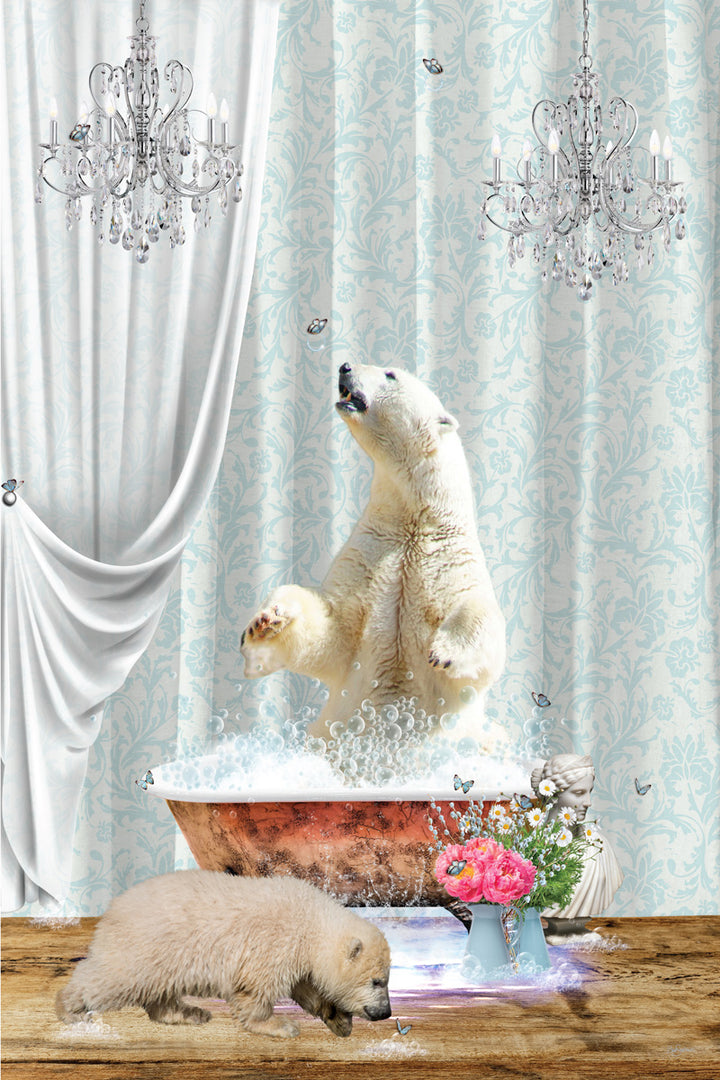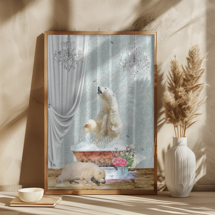 This wall decoration immediately transports you to an imaginative world full of humor, where polar bears build a surreal party in a bathtub among bubbles and cheerful flowers. Perfect for a playful interior or creative space where you love unexpected, funky details and want to bring a smile to your wall.