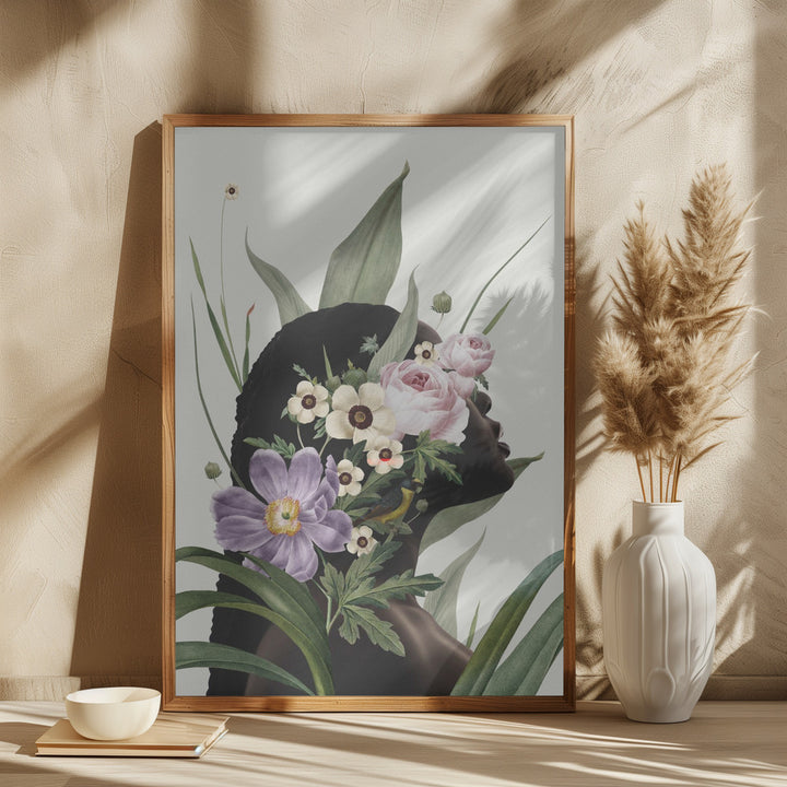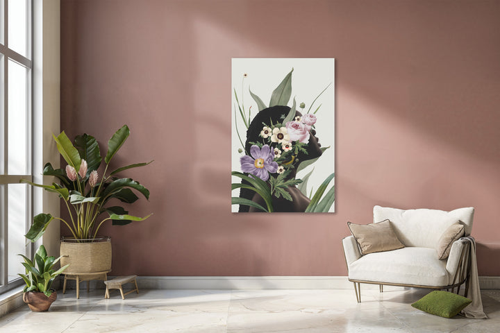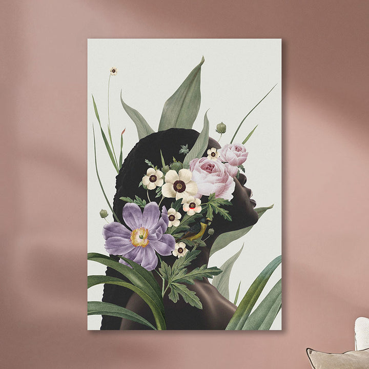 This wall decoration brings together an enchanting purple flower with a feminine, figurative touch, creating a dreamy botanical atmosphere in your interior. Perfect for modern living rooms or bedrooms, and beautifully combined with urban jungle styles or romantic spaces. This print effortlessly brightens up any wall.