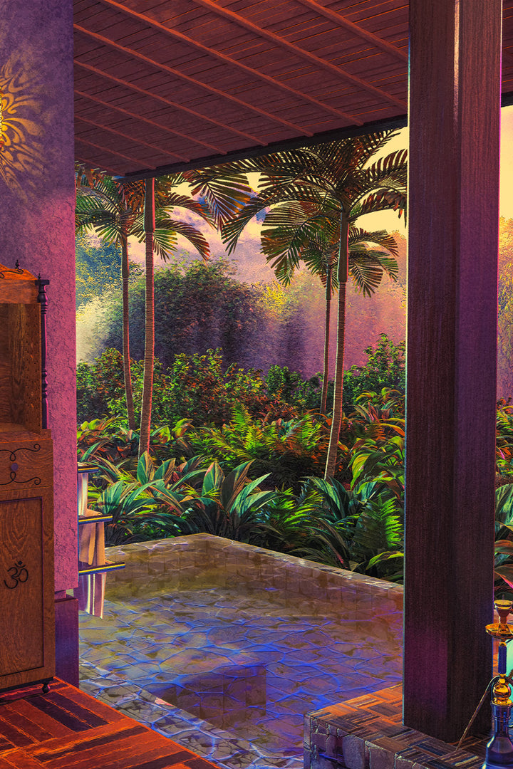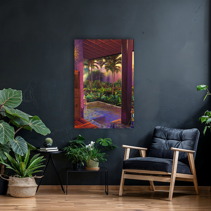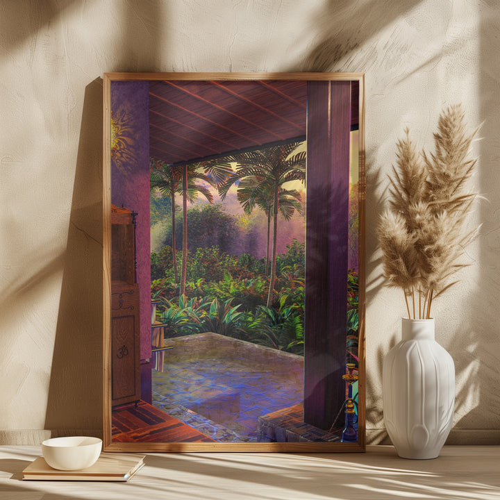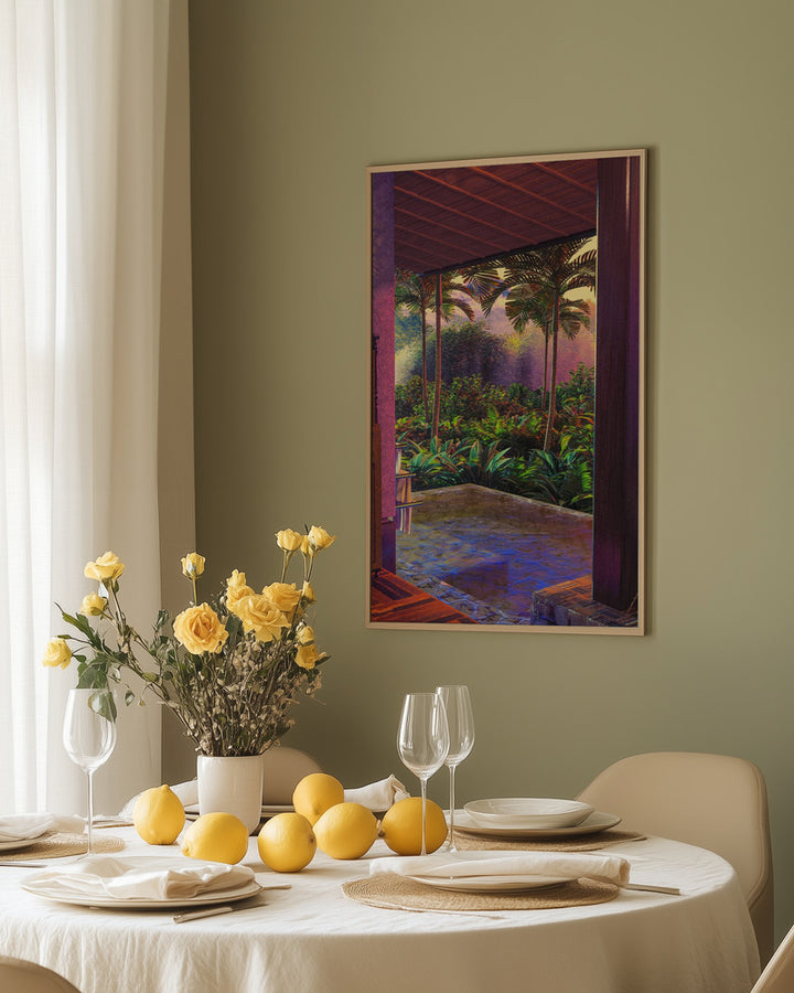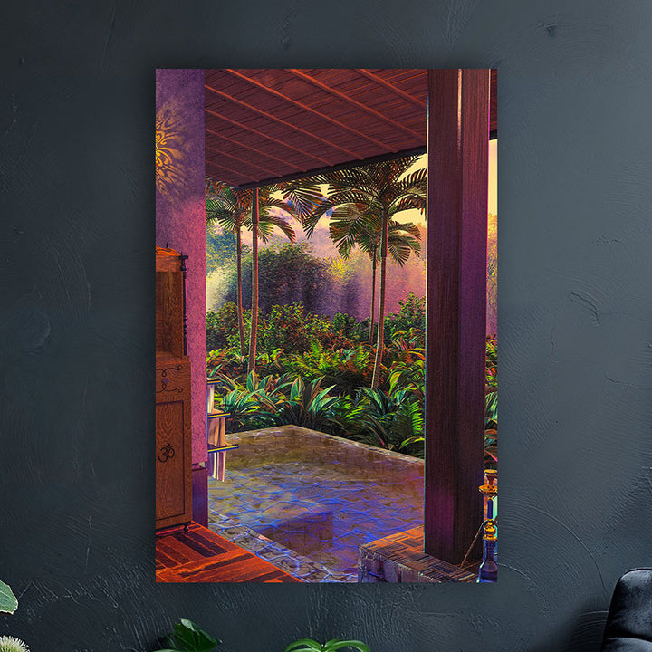 This painting takes you to an exotic rainforest with an enchanting infinity pool, surrounded by lush palm trees and tropical plants. Perfect for lovers of botanical and futuristic themes and a fresh touch in modern, retro, or minimalist interiors. Instantly create a colorful, calming atmosphere!