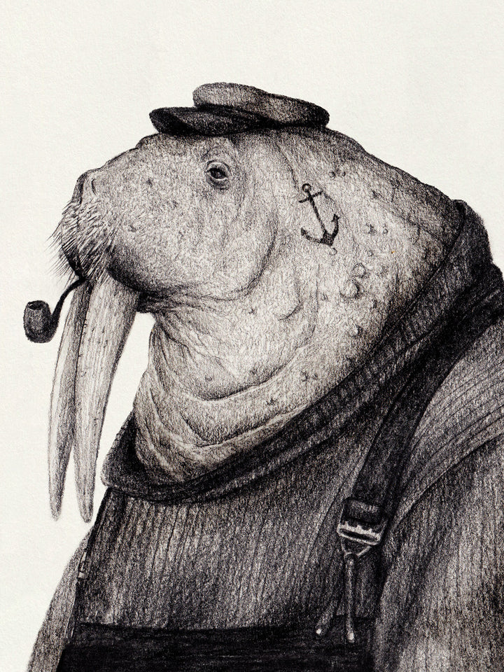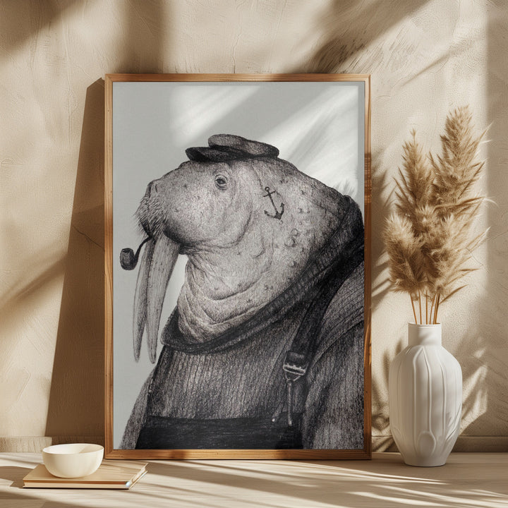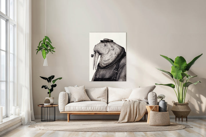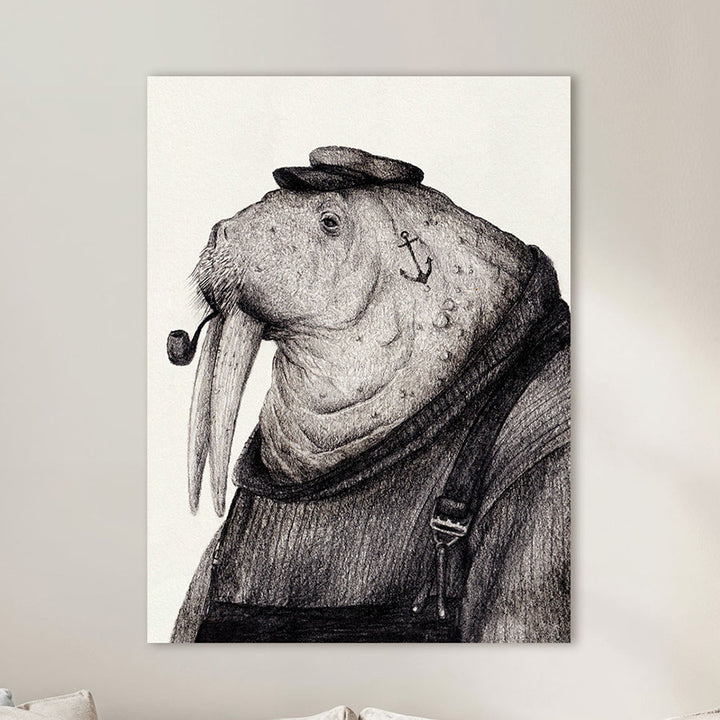 This wall decoration brings a tough walrus as a sailor with character to your wall, complete with cap and pipe. The black-and-white, drawn effect makes the painting perfect for those who love nostalgic details and a vintage style. This piece fills any interior with a touch of nautical charm and playful atmosphere.